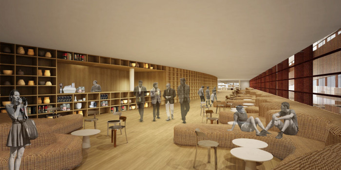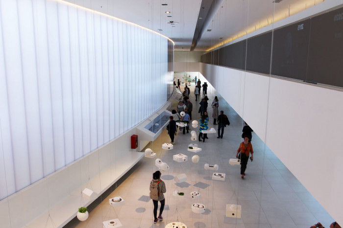 Interiér stavby je propojen s exteriérem chodníky a rampami, které vedou ven a zase dovnitř, a navzájem se míjejí. Do přízemí byla situována velká přednášková síň, oddělená od vstupního foyer velkou dřevěnou stěnou vyrobenou z polic, které symbolizují rukodílnou tvořivost Brazilců. Ozdobou této vstupní haly je práce bratrů Campanových: tři organické lavice vyrobené z rákosu.
