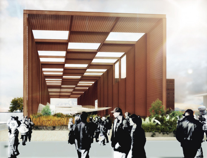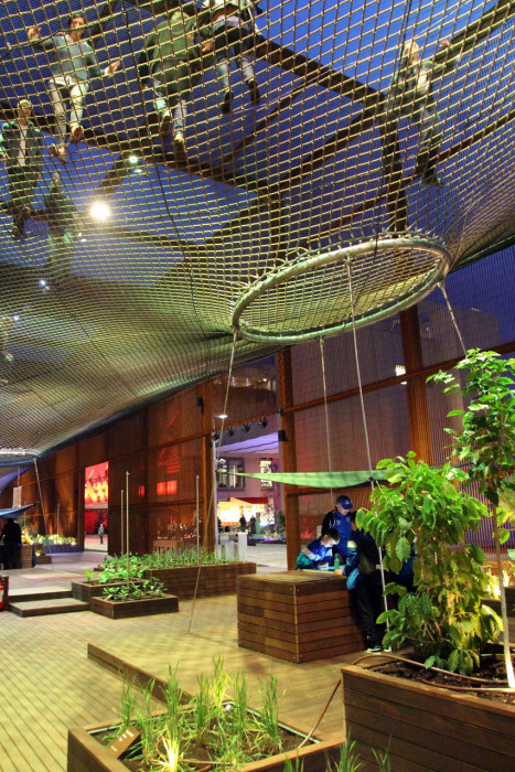 Pavilon je tvořen třemi základními prvky: chráněným prostranstvím označeným jako „plaza“, gigantickou sítí organického tvaru a multifunkční budovou.