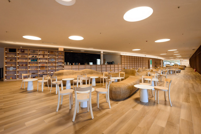 Multifunkční budova je obložená korkem, jehož odstín ladí se zemitými tóny konstrukce.
