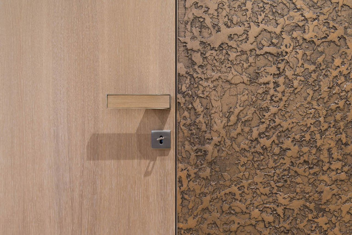 Interiér ctí materiálově přírodního ducha celého návrhu, kde dominantním prvkem je podlaha z dubových prken. Kamenný obklad z fasády nahradila v obytné místnosti hrubá stěrka v zemitém až měděném odstínu, která dává vyniknout interiérovým dveřím přes celou výšku místnosti. V hlavním prostoru je použito solitérních prvků, které se vyznačují oblými tvary, a tak zde není žádný roh, který by obyvatele „ohrožoval“. Toto uspořádání zároveň nechává volnou ruku majiteli k využití prostoru, kdy stabilním prvkem je umístění závěsného krbu a vestavného květináče.