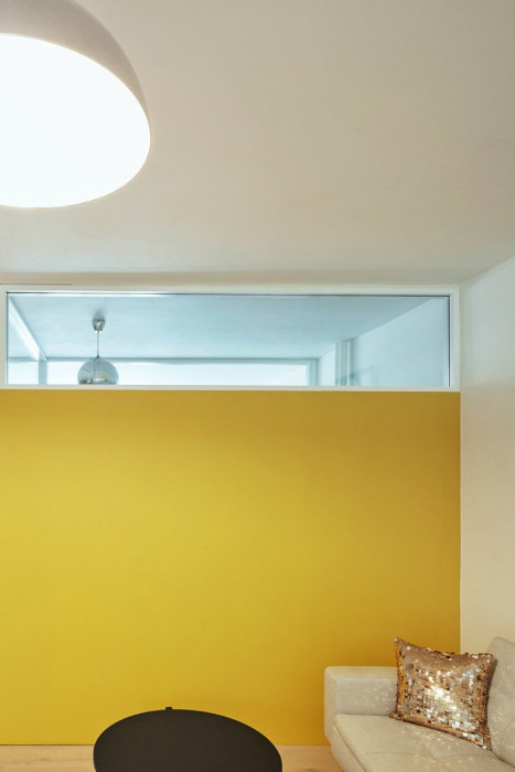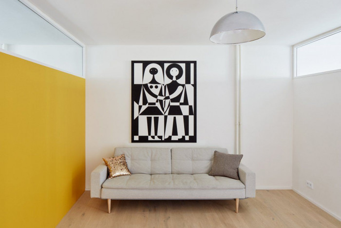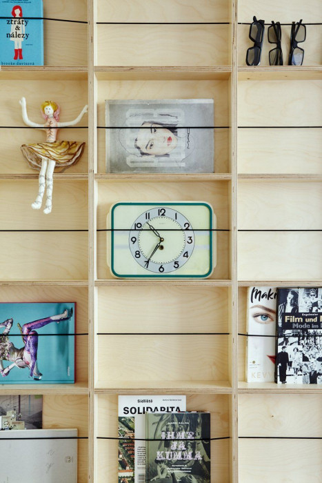 Z popela původní dělené a neprosvětlené dispozice povstal jako Fénix nový půdorys. Ten reaguje na potřeby pětičlenné umělecké rodiny. Díky rozmístění světlíků ve stěnách může denní světlo proniknout do všech místností bytu. Hala má dostatek úložných prostor a propojuje obytné prostory se vstupem a zázemím bytu. Hlavním těžištěm bytu je jídelna s kuchyní, kde se u velkého stolu odehrávají společná setkání s prarodiči, kamarády i kolegy. Jídelnu propojuje s obývacím pokojem čtyřboká knihovna s čtenářským koutkem. Tento kus nábytku slouží nejen k ukládání čtiva, ale také jako rodinná nástěnka či výstavní prostor pro suvenýry. Obývací pokoj s pracovním stolem odděluje ložnici rodičů od pokojů pro dvě mladší děti. Třetí, nejstarší potomek má k dispozici svou osobní trucovnu.
