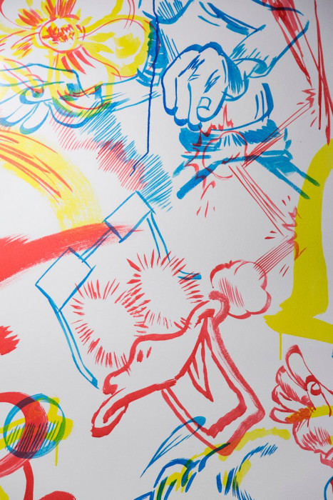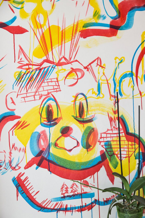 Dubová parketová podlaha byla z části obnovena a doplněna. Pro sjednocení a podtrhnutí chodbové dispozice jsme navrhli celou stěnu pomalovat kresbami. Motivy ani témata nemají žádný konkrétní význam, jde čistě o dekoraci. Jedná se volnou kombinaci kaligrafie, graffiti a pop-artových motivů. Svoji významovou nezatížeností a funkcí ornamentu navazují na původní ornamenty charakteristické pro celý dům. Barevnost maleb je odvozena ze soutiskové techniky a je aplikována na tradiční židle Thonet. Díky těmto a dalším dialogům starého a nového je možné interiér vnímat z různých poloh.