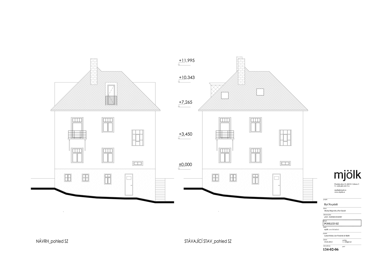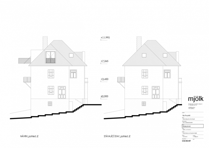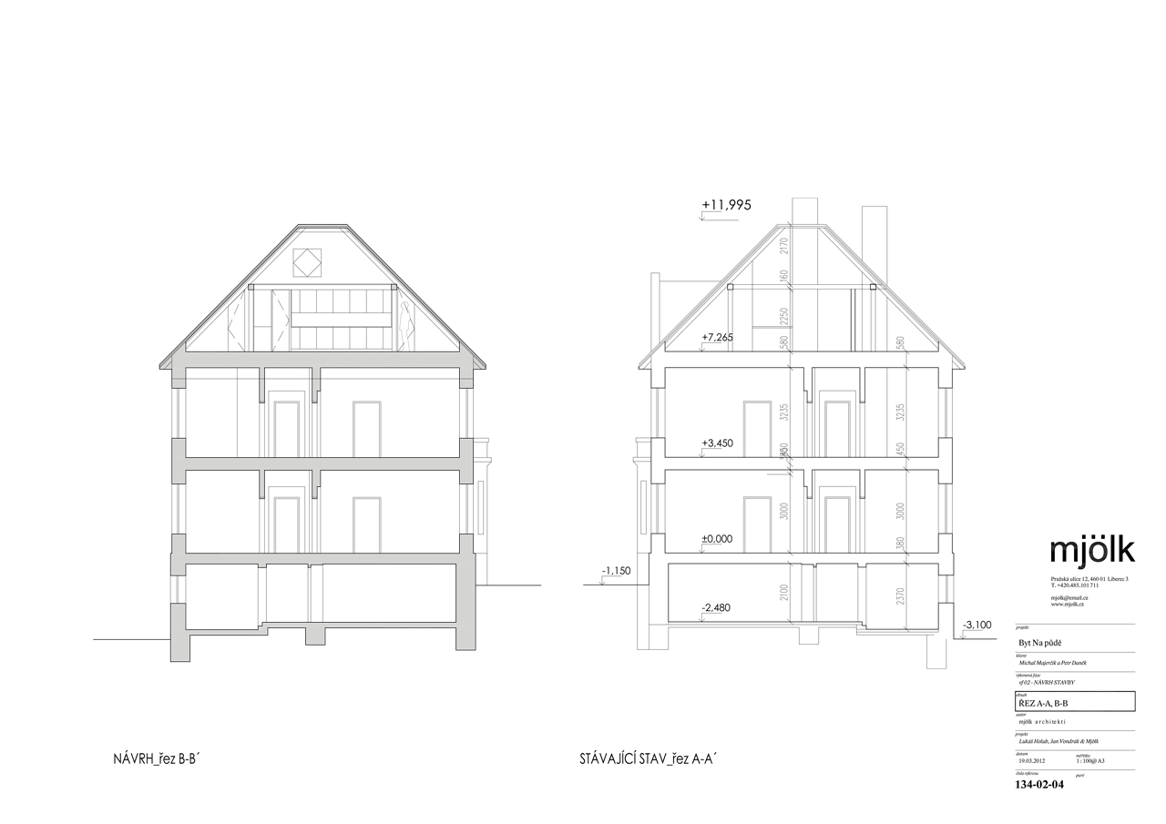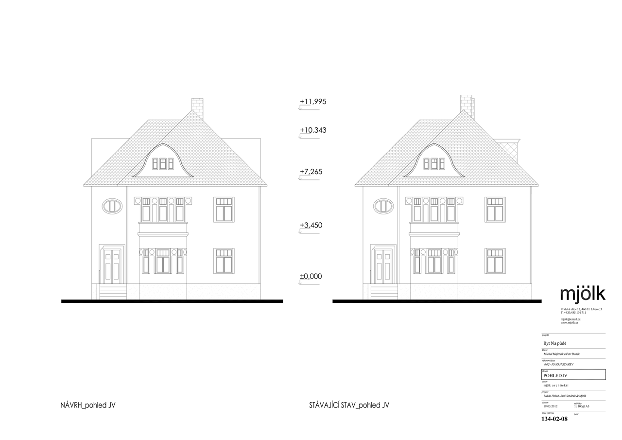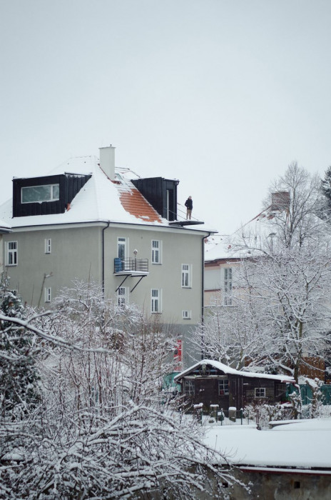 Zadáním byla rekonstrukce fasády a vestavba půdního bytu do stávajících půdních prostor. V průběhu navrhování jsme se nakonec s klienty rozhodli propojit půdní prostory s dolním bytem tak, aby nabízel dostatečně velkorysé prostory pro život i případné rodinné návštěvy.
