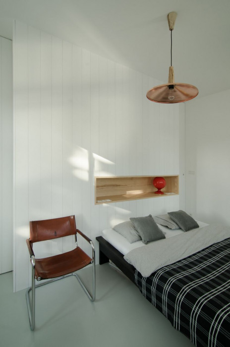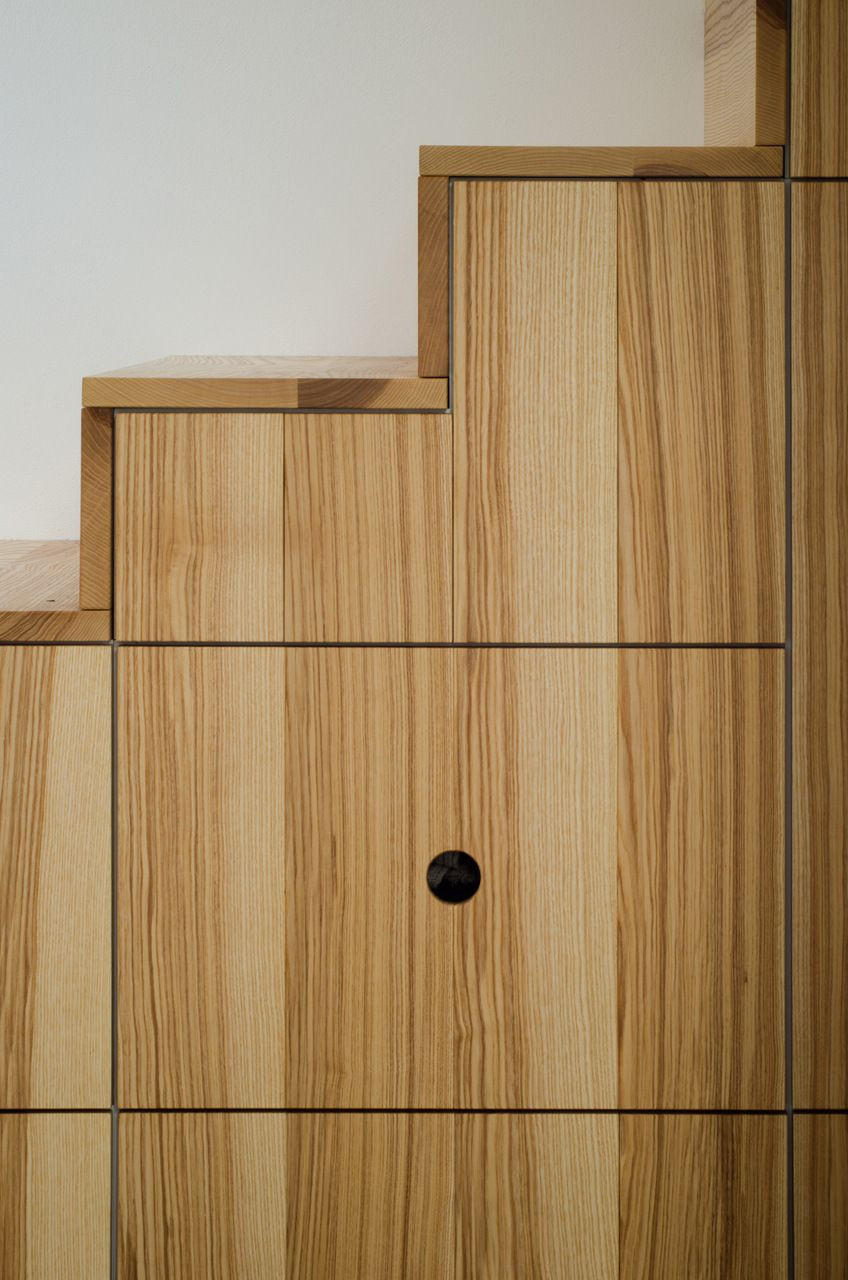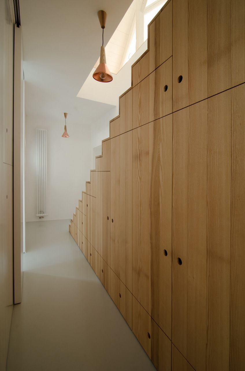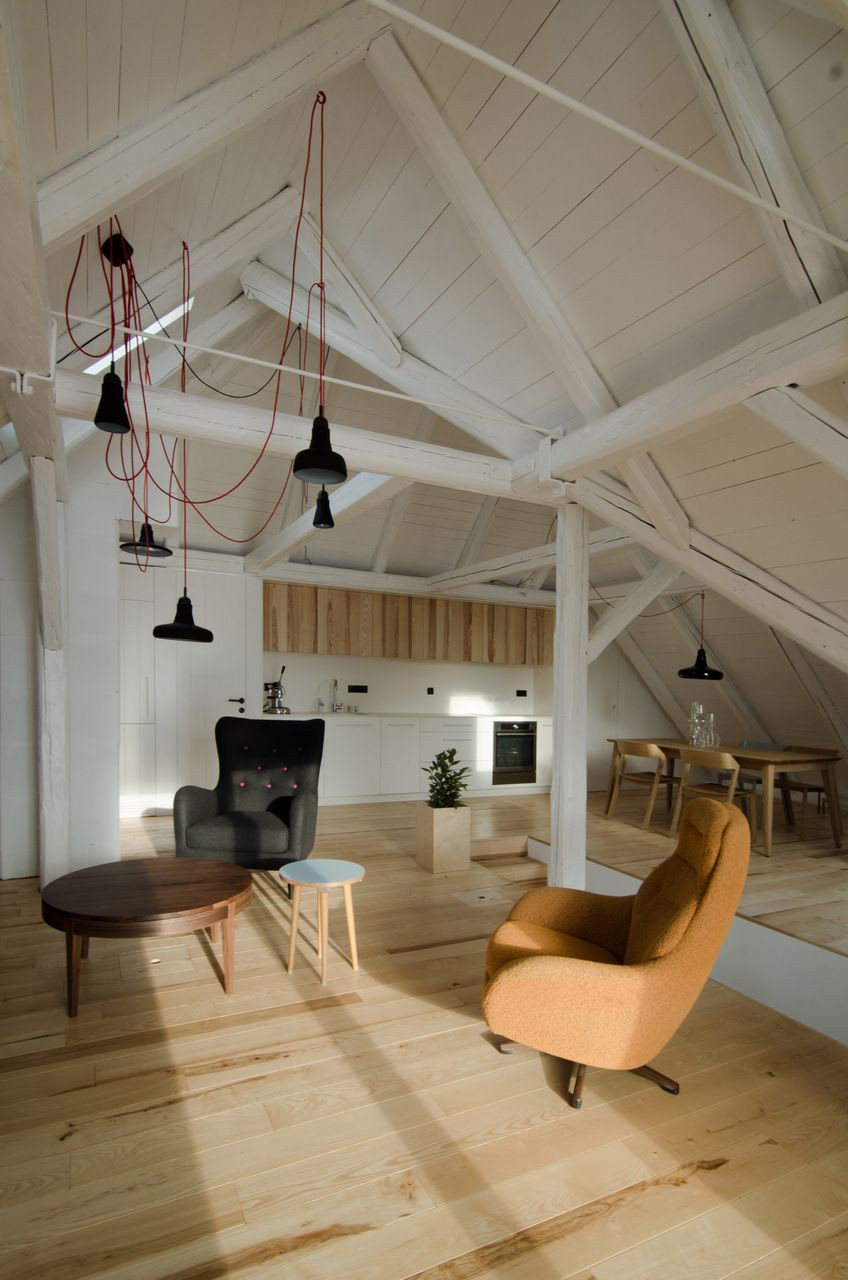 Půda je pro dva fajn lidi v jejich domě. Chtěli jsme zanechat půdě volnost a nekrájet jí na místnosti. Proto se po jedné straně objevil vestavěný box s kuchyňským koutem, koupelnou s WC a dvěma šatnami. Schodiště vstupního patra, ze kterého jsme si půjčili jednu místnost a udělali z ní ložnici, jsme narovnali a použili zároveň jako vestavěnou skříň. Vyjdeme po něm a narazíme přímo na kuchyň, nalevo je obývací část, napravo jídelní kout.