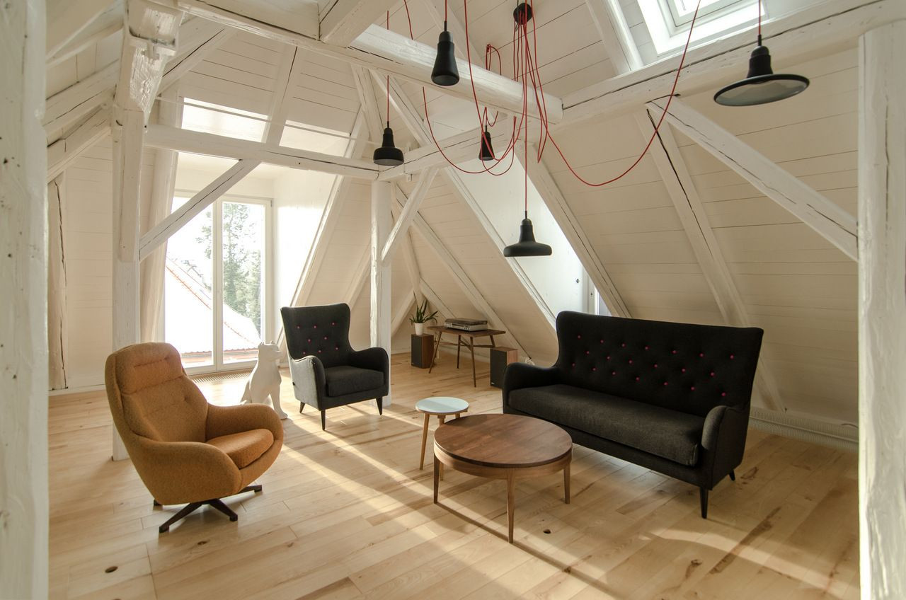 Původní půda byla zateplena nadkrokevní izolací, aby mohl mít interiér odhalenou konstrukci krovu a podbití. Lávka z obytného prostoru je zavěšena na táhlech kotvených do střešní konstrukce. Propojení pater si vyžádalo nové schodiště a s ním související trámovou výměnu ve stropní konstrukci.