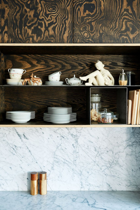 Nový materiál, který je asi v největší míře použitý v interiéru, je borová překližka, která je ošetřena přírodním černým voskovým olejem. Její dekor vytváří další grafickou strukturu v bytě. Je použita na kuchyňské lince, která přechází do hlavního prostoru jako knihovna, posteli a skříních, ale také skříni v koupelně.