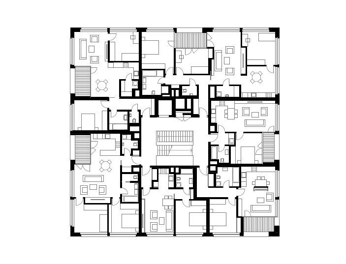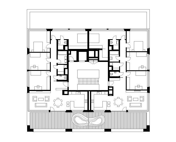 Architektonické řešení je založené na jednoduchém strukturálním motivu rastru okenních otvorů integrovaných se zasklenými lodžiemi přináležejícími k jednotlivým bytům, který racionálně propisuje vnitřní uspořádání dispozice domu, ale umožňuje zároveň její proměny při zachování existujícího vzhledu.