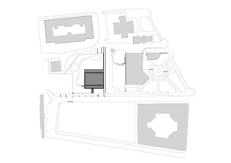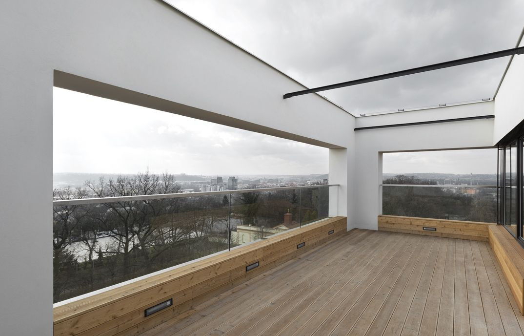 Hmota objektu blízká rozměry kostce je situována na podnož suterénu, který - díky konfiguraci terénu v místě - částečně vystupuje na severní straně na výšku jednoho podlaží nad jeho úroveň a vymezuje tak plochu zahrady, zároveň je dále modelována ustoupením posledních podlaží severním směrem a konzolou v místě vstupu do domu. Reaguje tak na urbanistické souvislosti místa (kryté předpolí vstupu, či ustoupení a tudíž snížení hlavní atiky směrem v ulici Bulovka).