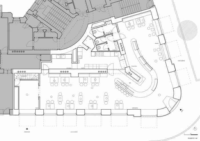 Zásadní byla výměna oken, kdy pevné kovové výkladce byly nahrazeny za výsuvná okna, která prostor propojily s parterem ulice. Návrh interiéru reflektuje zaoblené nároží domu a odráží ho v centrálním pultu, který v jedné části přebíhá do baru a v druhé do prodejního pultu pekařství.