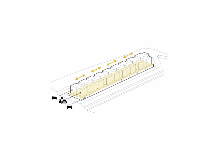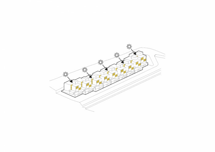 Projekt obsahuje 27 veľkometrážnych bytov usporiadaných v deviatich samostatných domoch. Všetky domy sú prístupne jednou spoločnou vnútro-areálovou cestou, zoradené sú líniovo. Na obidvoch koncoch sú ustúpené podľa vejárovitého tvaru pozemku. Každý dom má tri nadzemné poschodia a jednu spoločnú garáž umiestnenú v suteréne. Na každom poschodí je jeden byt priamo prístupný z výťahu. Typologický sa jedna o rodinné domy, keďže v každom z nich sú tri byty.