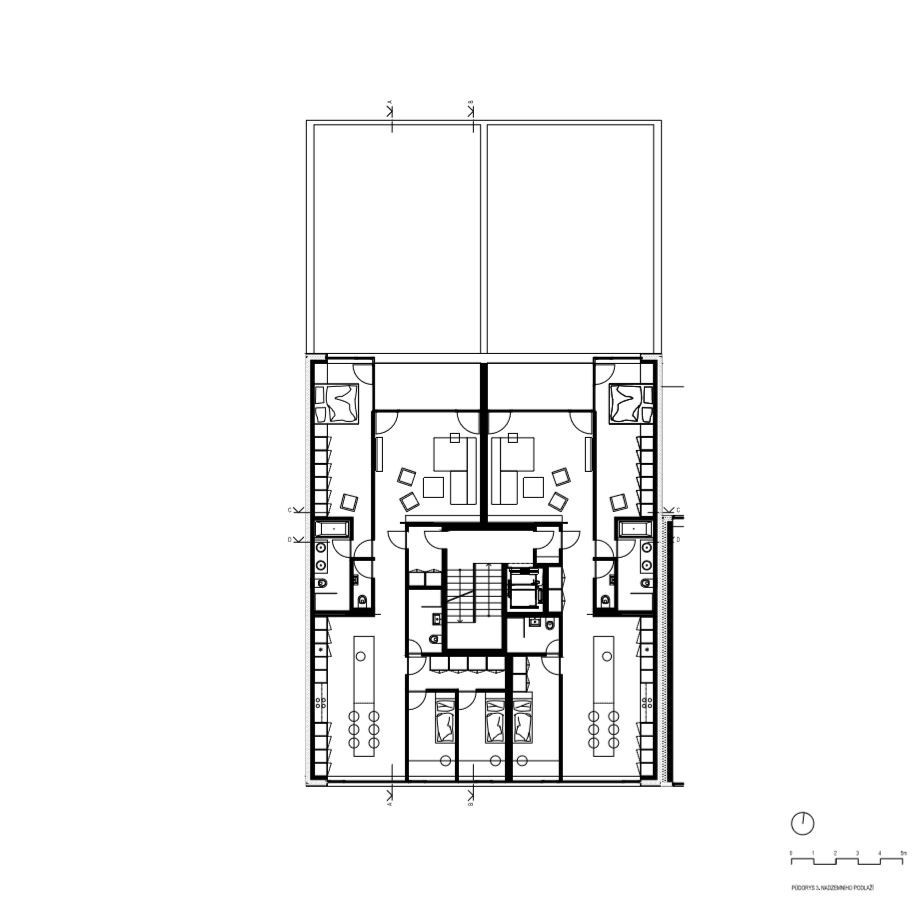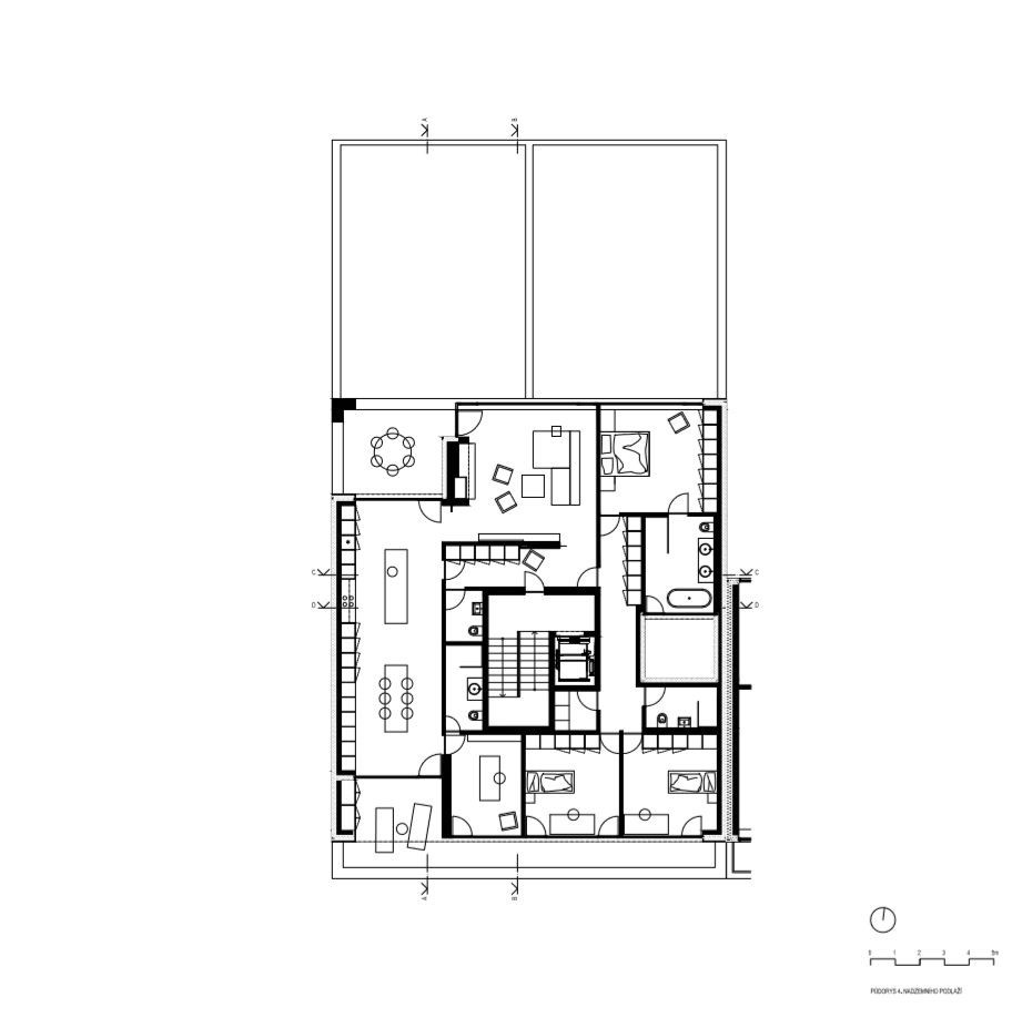 Podzemní podlaží je rozloženo na celou velikost parcely a tvoří je parkování přístupné z vedlejšího polyfunkčního domu, sklepní kóje a technické zázemí objektu. Zvýšené přízemí domu sestává ze dvou bytových jednotek o velikosti 4+kk doplněných o zahrady zřízené na ploše nad podzemním parkováním. Druhé a třetí nadzemní podlaží sestává vždy ze dvou bytových jednotek o velikosti 5+kk a 4+kk. Poslední ustoupené podlaží sestává z jednoho bytu o velikosti 6+kk doplněného o dvě střešní terasy a jedno atrium.