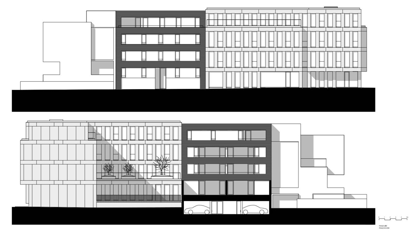 Navržený dům o čtyřech nadzemních podlažích sleduje stávající stavební čáru a je rozložen na celou šířku parcely. Římsa objektu ve třetím nadzemním podlaží navazuje na hranu římsy vedlejšího polyfunkčního domu, stejně jako hloubka ustoupení posledního čtvrtého podlaží.
