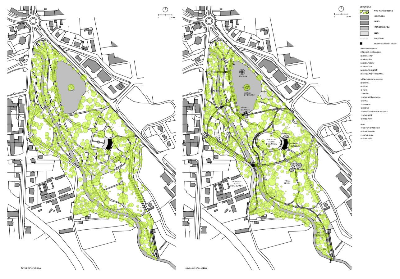 Soubor staveb v rámci krajinářského areálu obsahuje nový vodní program - před Kolonádou byla vytvořena nová fontána s textem prezidenta Václava Havla, uprostřed hladiny rybníka vznikl nový vodní výstřik a dočerpávání vody do rybníka. Dále byl nově konfigurován sochařský program. Původní čtyři alegorické sochy ročních dob Jaro, Léto, Podzim, Zima a pátá socha Jitřenky, resp. pomník Františku Xaveru Mercandinovi byly situovány jako protiváha Kolonády na analogicky obloukovém půdoryse. Stavba rovněž zahrnuje kompletní obnovu technické infrastruktury - vodovod, kanalizace, novou přípojku plynu pro Kolonádu, elektro a veřejné osvětlení.