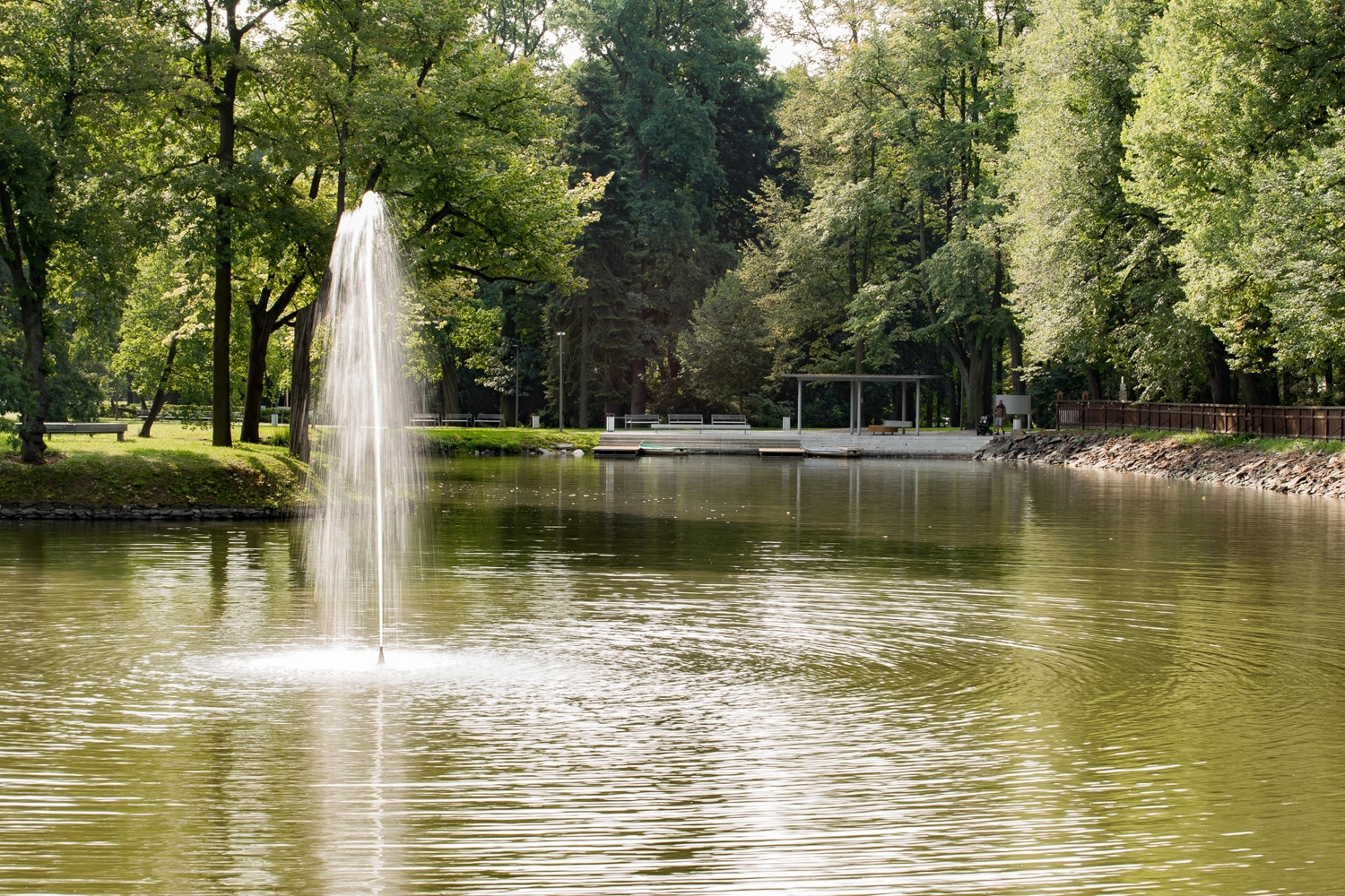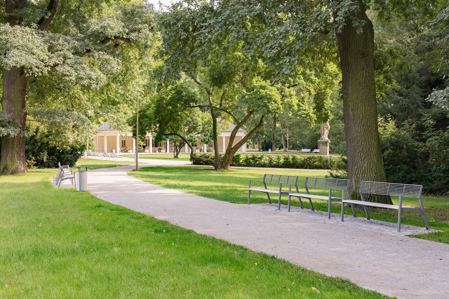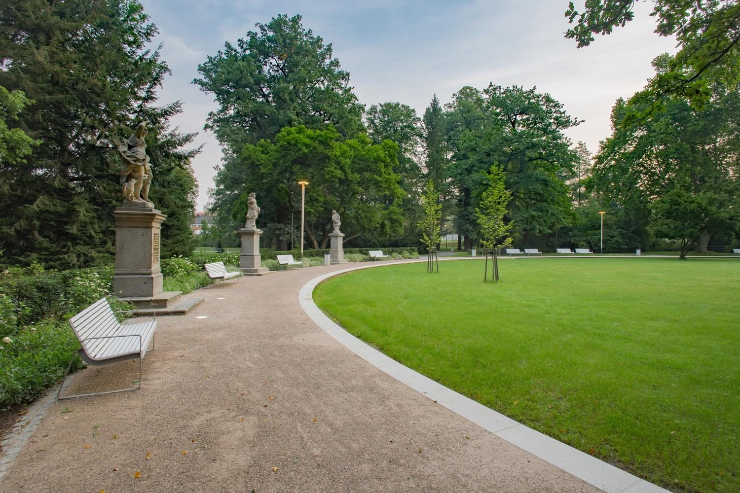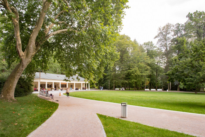 Cestní síť je navržena tak, aby vyhovovala pobytu lidí v parku a zároveň, aby obsloužila hlavní tranzitní směry. Z těchto důvodů je před kavárnu Kolonáda vložena nová oválná promenáda, která vymezuje centrální prostor a společenské ohnisko parku. Velký ovál vychází z historického zahradního parteru před Kolonádou. Promenáda se lehce vznáší nad centrálním paloukem díky zvednuté oválné římse. Uvnitř této římsy je koncipován obytný trávník s automatickou závlahou. Na centrální parter navazuje vodní plocha s novým přístavištěm a altánem. Uprostřed vodní hladiny byl obnoven kruhový ostrov včetně nové konvexní modelace. Na ostrov byl dle návrhu osazen nový pomník v podobě kruhové lavice z kamene od Václava Fialy, který je dedikován krajinářskému architektu Václavu Weinfurterovi. Na jaře jsou všude na ostrově rozkvetlé narcisy v trávníku.