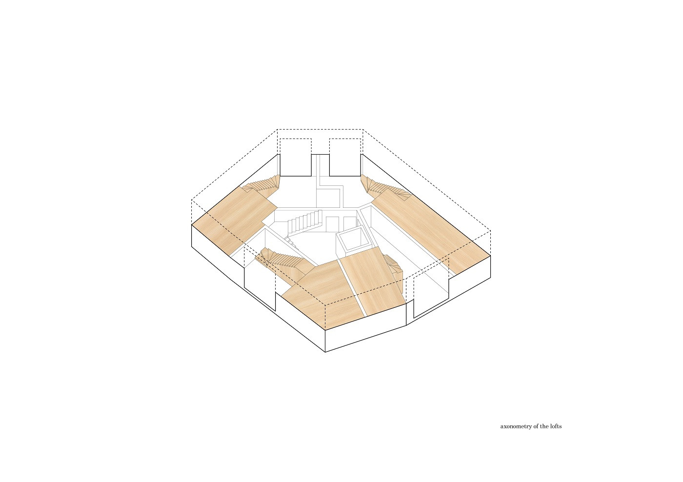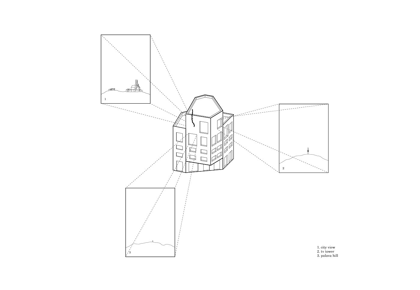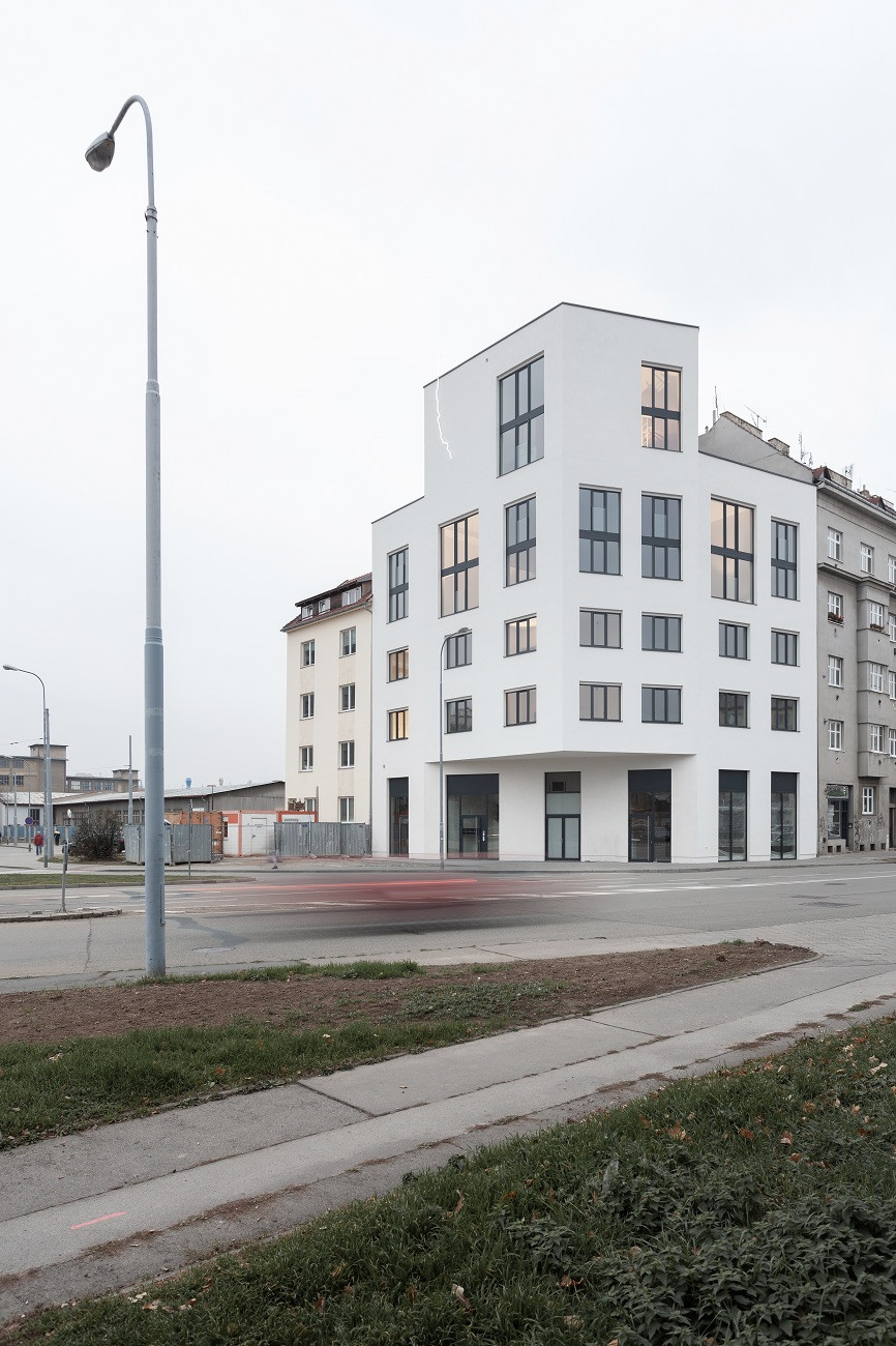 Dominantním prvkem stavby jsou rozměrná okna, odkazující na průmyslové dědictví čtvrti, jež zvenku fungují jako klíč k pojetí konkrétních jednotek. Jejich rozměry napříč patry výrazně gradují od dvoupodlažního komerčního přízemí přes malometrážní byty až po lofty s privátní terasou a šestimetrovou světlou výškou. Jádrem domu se točí sochařsky pojaté schodiště, jež se vyrovnává s limitovanou plochou parcely 269 metrů čtverečních. Výsledná forma nepravidelného polygonu udává bytům atypický ráz a prostorovou jedinečnost. V přízemí se kolem ústředního schodiště vine komerční plocha pro jednoho až dva nájemníky, druhé a třetí patro nabízí celkem osm menších bytových jednotek o výměře 40 až 55 metrů čtverečních, ve čtvrtém se nachází čtveřice menších loftových bytů s dřevěnou vestavbou a v pátém dva rozměrné lofty s vestavbou, soukromými terasami a výrazně převýšeným interiérem. Všechny pak propojují materiály železobetonu, jasanového dřeva a bílých zdí i skvělé výhledy do okolí – směrem na jih na budoucí náměstí a malebnou Pálavu, na sever pak do vnitrobloku a také na centrum města včetně všech pamětihodností jako Špilberk či Petrov.