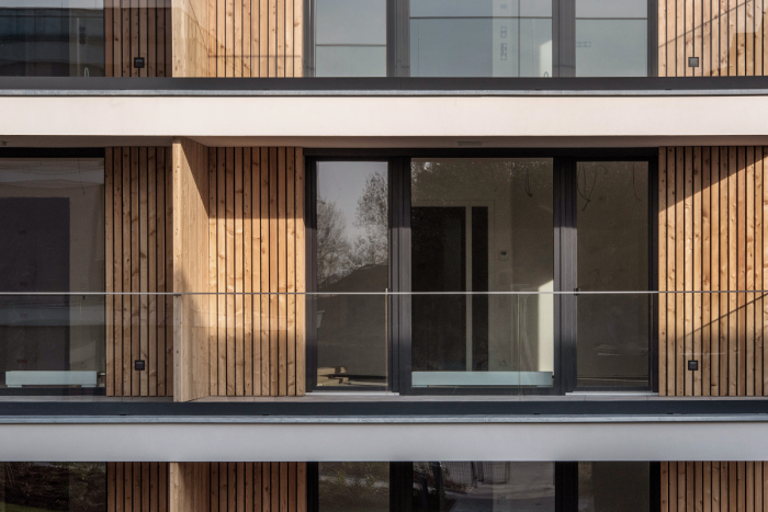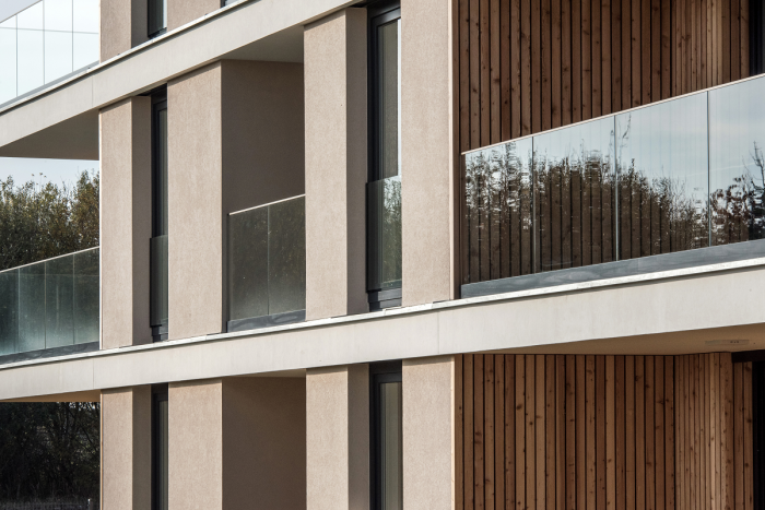 Přírodní charakter bydlení je dále rozvíjen v architektonické úrovni návrhu, a to především volbou materiálů, kdy jako hlavní výrazový prvek domů je použit obklad lodžií modřínovým dřevem bez povrchové úpravy.