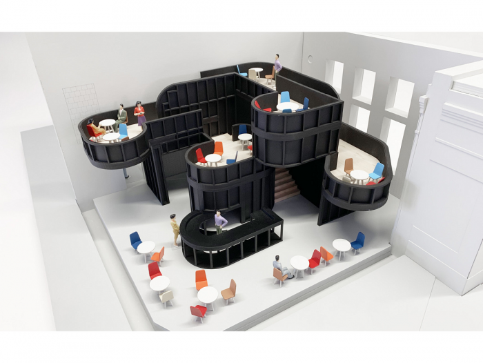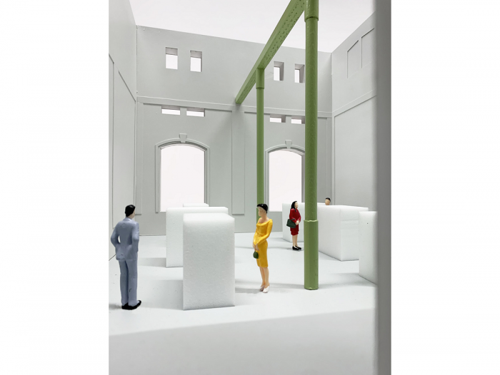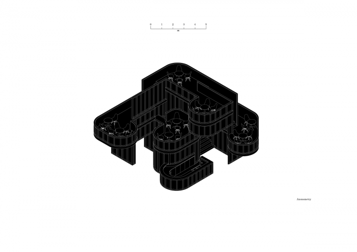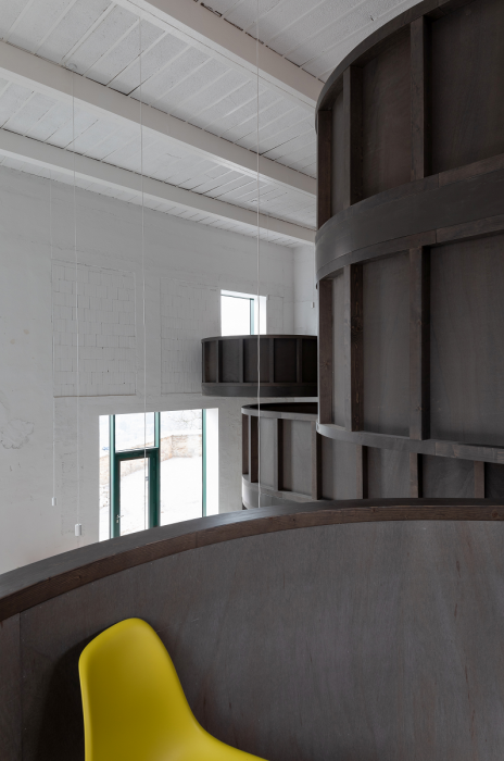 Z bývalé technické haly byla naopak zachována pouze vnější struktura s úmyslem vytvořit zcela nový koncept, který v rámci Enotéky funguje jako volný otevřený prostor. Do strohého bílého interiéru je vložena kontrastní tmavá vestavba, hravá kompozice organických objemů v různých úrovních rozdělující tuto „bílou krabici“ na jednotlivé prostory a menší vzájemně propojené místnosti, čímž odkazuje na měřítko a atmosféru tradičních místních vinných sklepů. Tento nově pojatý vinný bar tak mění původní význam architektury i funkce haly.