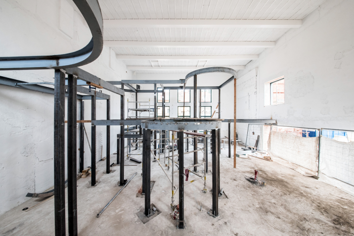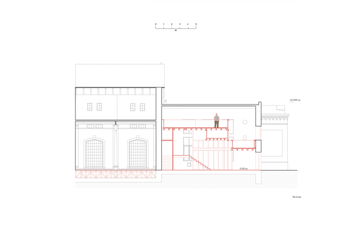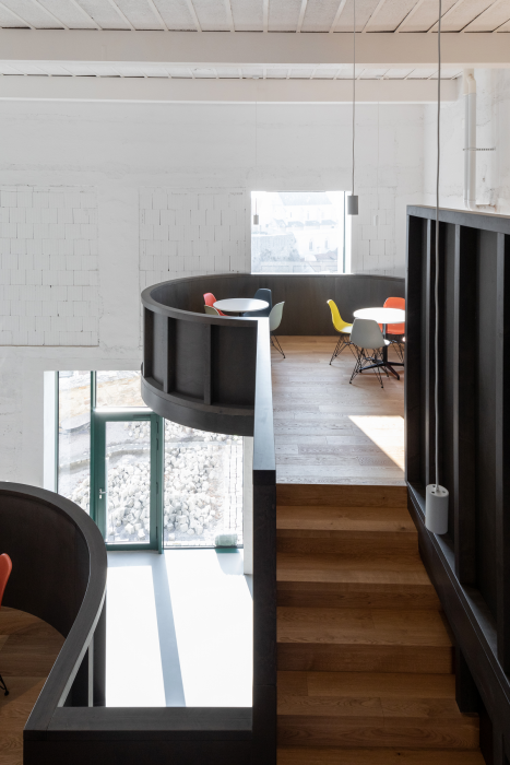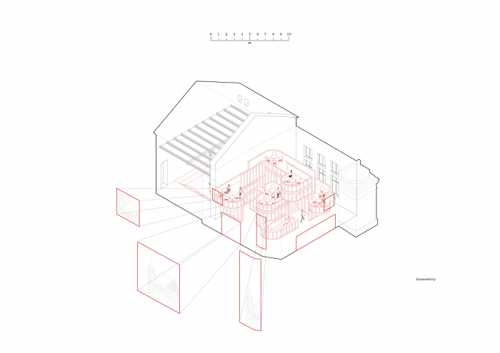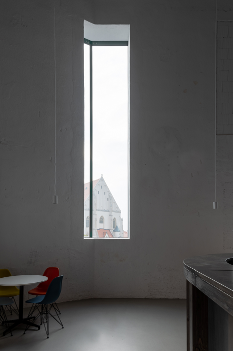 Bývalá technická hala se otevřela okolí a výhledům na sousedící kostel a město díky komplexní sestavě asymetrických oken, která jsou rozmístěna tak, aby podtrhla rozčlenění interiéru na různorodé prostory, a tyto prostory naopak orientovala zpět na nové výhledy. Nová okna nyní zvou návštěvníky k dialogu s krajem a krajinou – čímž zároveň kotví tuto zdánlivě zastaralou strukturu mezi ostatní architektonické skvosty města. Odstín průčelí vznikl kombinací různých barev sousedících budov, což dále podporuje interakci v rámci historické koláže a posiluje architektonický a historický pocit sounáležitosti.