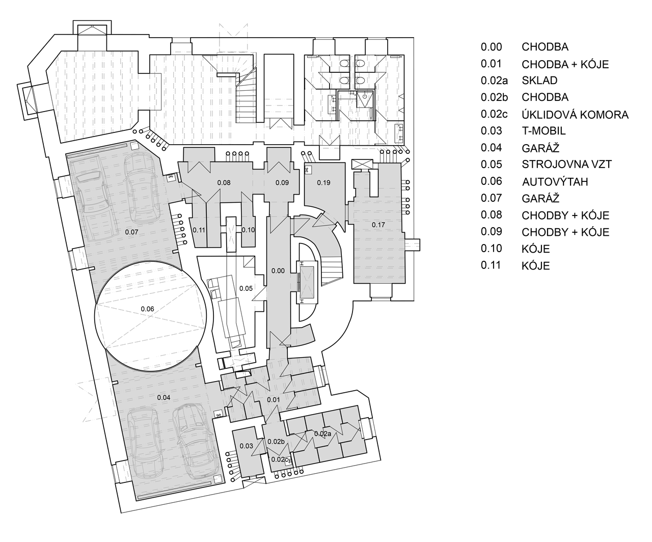 Vjezd do garáží je situován v prostřední okenní ose z ulice Sochařská. Přístup do suterénu řeší autovýtah,, který sveze automobil i s řidičem do 1. podzemního podlaží, kde jej točna automaticky dle předvolby natočí na jedno ze čtyř parkovacích míst.