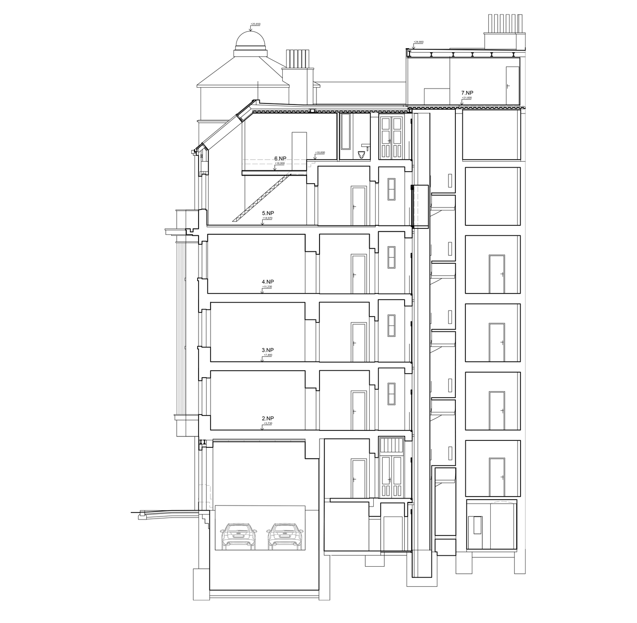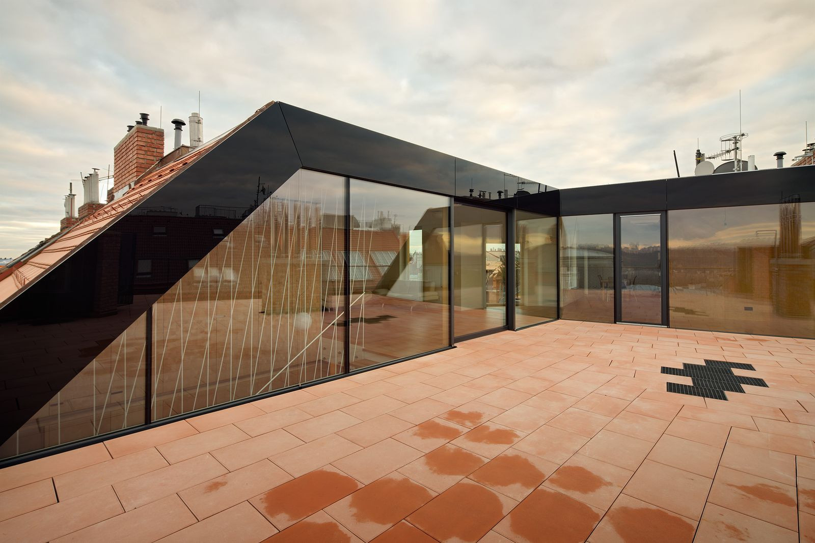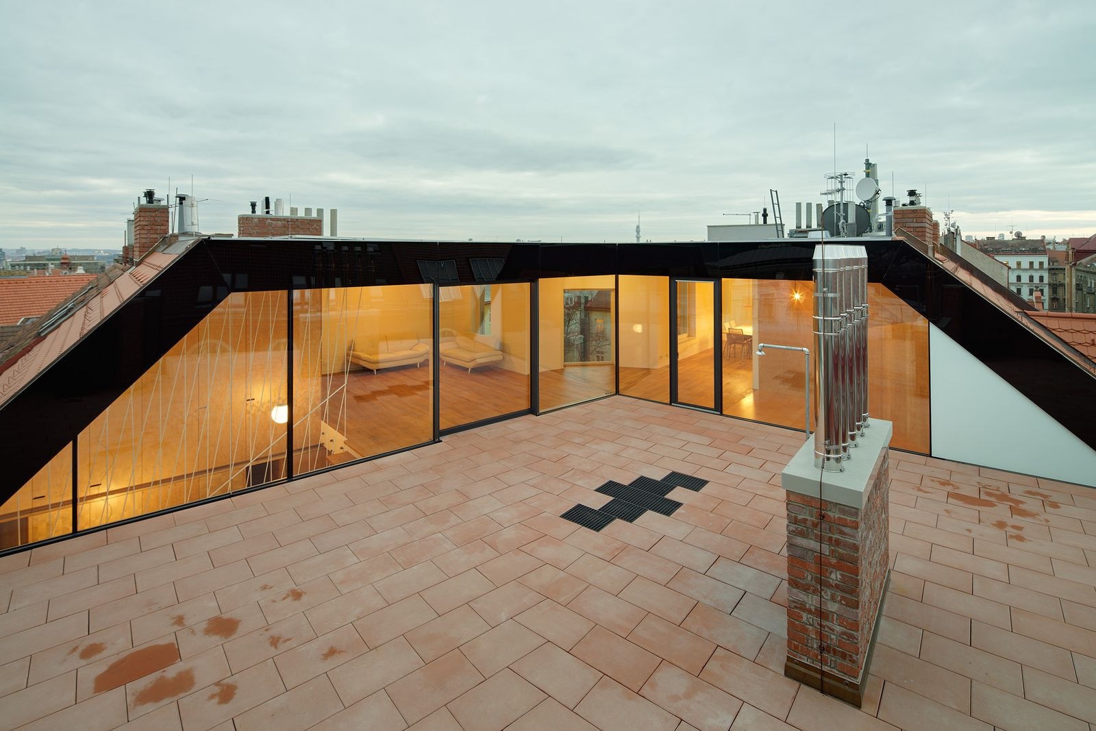 Rekonstrukce střechy s nástavbou je spojena s rekonstrukcí 5. NP. V něm tak nově vznikly dva mezonetové byty. Jejich rozšíření vertikálním způsobem bylo z hlediska rozmístění světlíků a komínových těles optimálním řešením. Větší z mezonetových bytů je infrastrukturou i polohou schodiště připraven na možné opětovné rozdělení. Dále jsou v 5. NP ještě dva další byty.