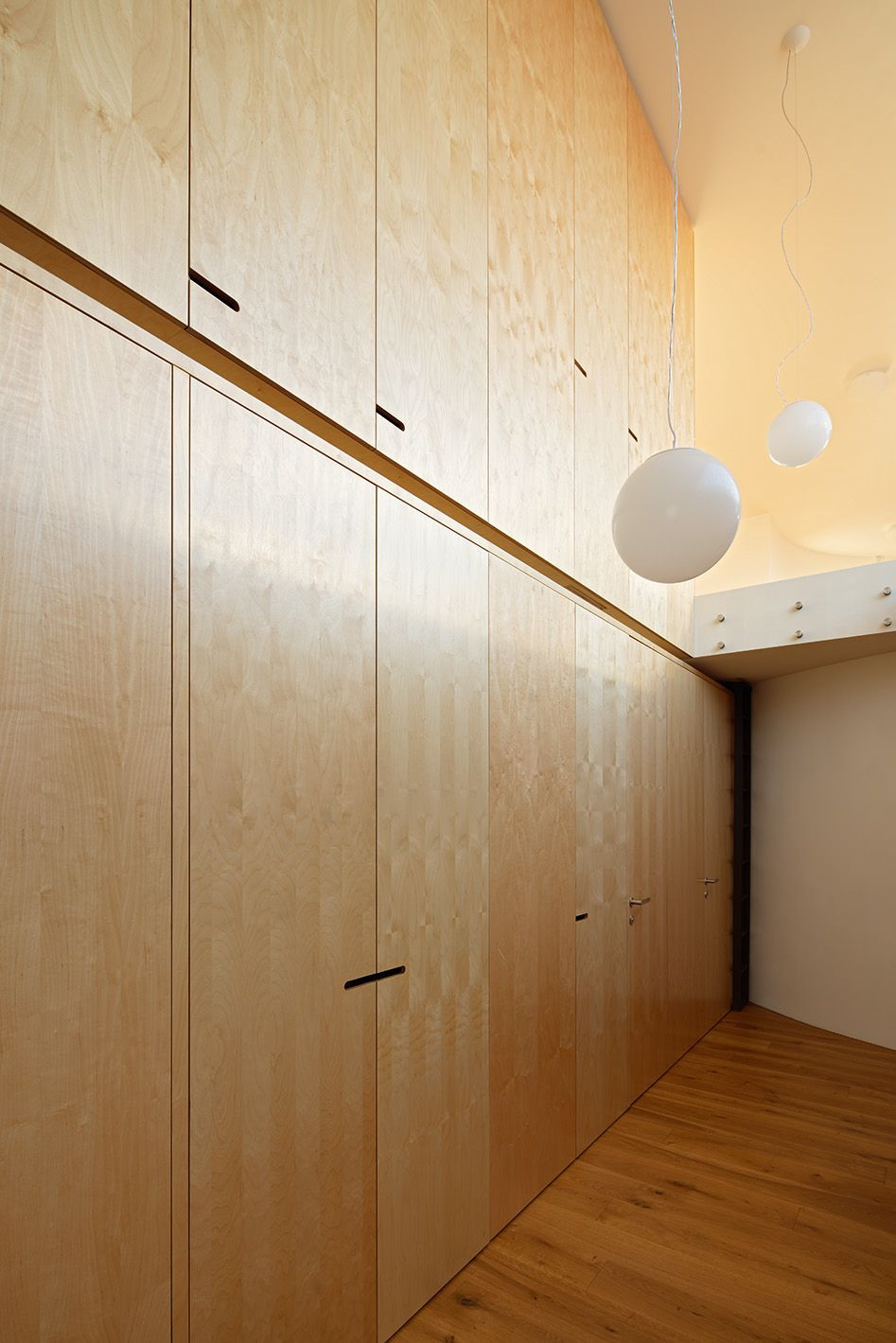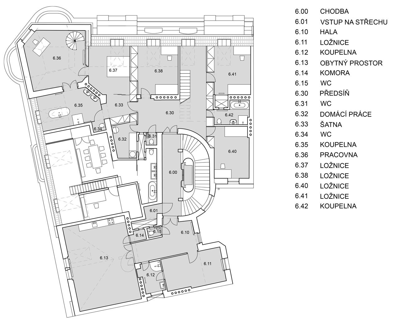 V šestém patře je pak pouze vstup do posledního, velkoryse pojatého, mezonetového loftu. Ten je dispozičně rozdělen na noční část v 6. NP a denní část v 7. NP, spojenou s terasou a výhledem.