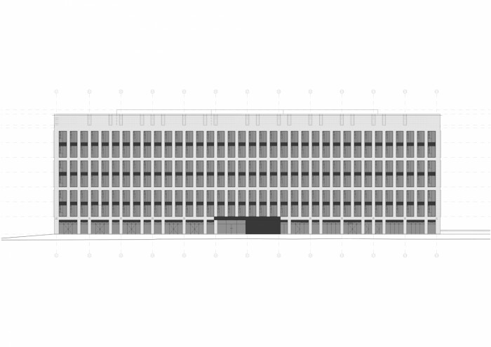 Velkorysé jednoduché objemy administrativních budov jsou na pozemku umístěny zdánlivě nahodile. Ve skutečnosti finálnímu řešení předcházelo nespočet variant výpočtů ploch a úhlů, rozmístění a velikost jednotlivých hmot, a zkoumání jejich vzájemných vazeb. Výsledkem je pečlivě zkonstruovaná geometrie tří stejných objemů a volného prostoru mezi těmito objemy.