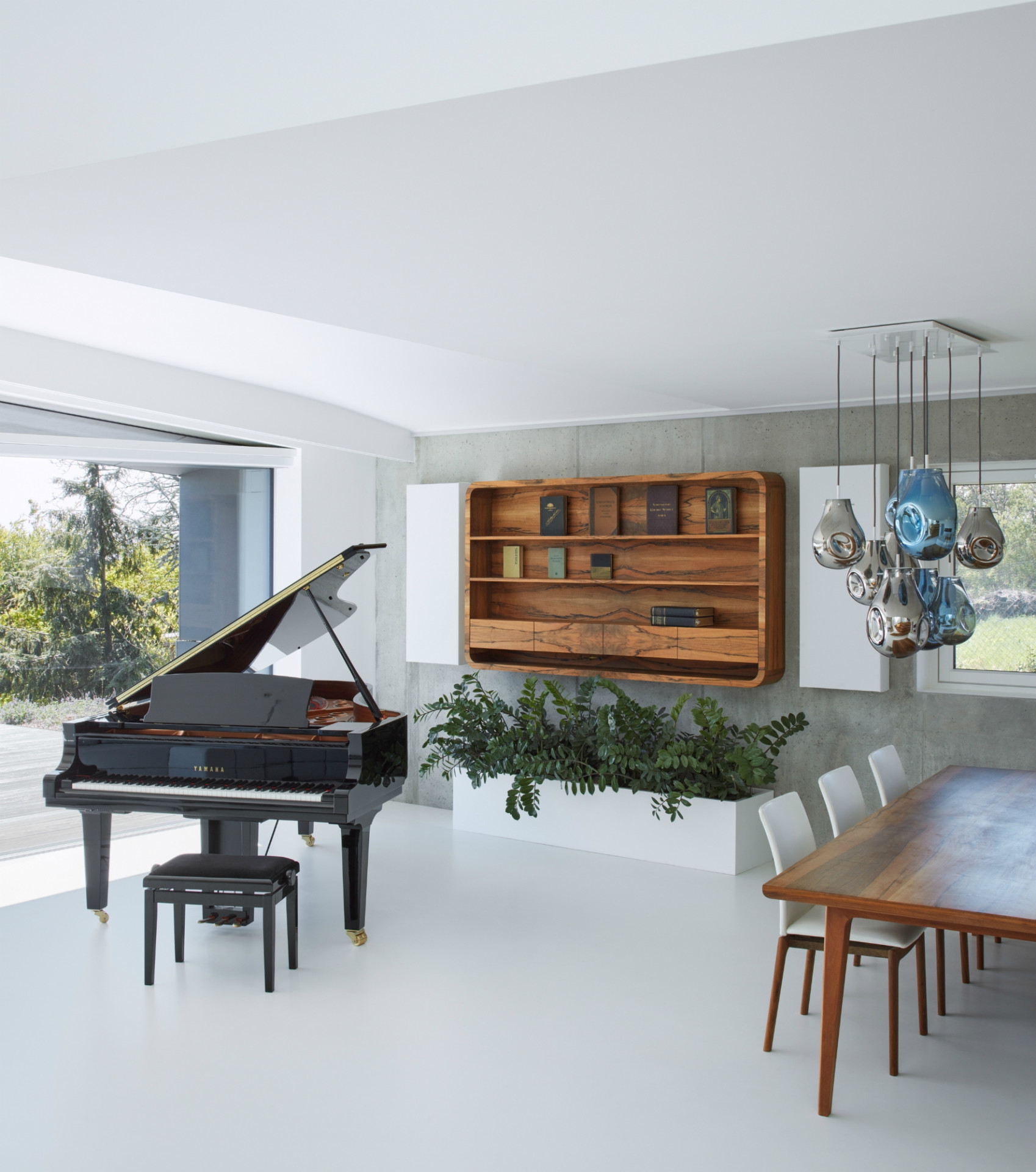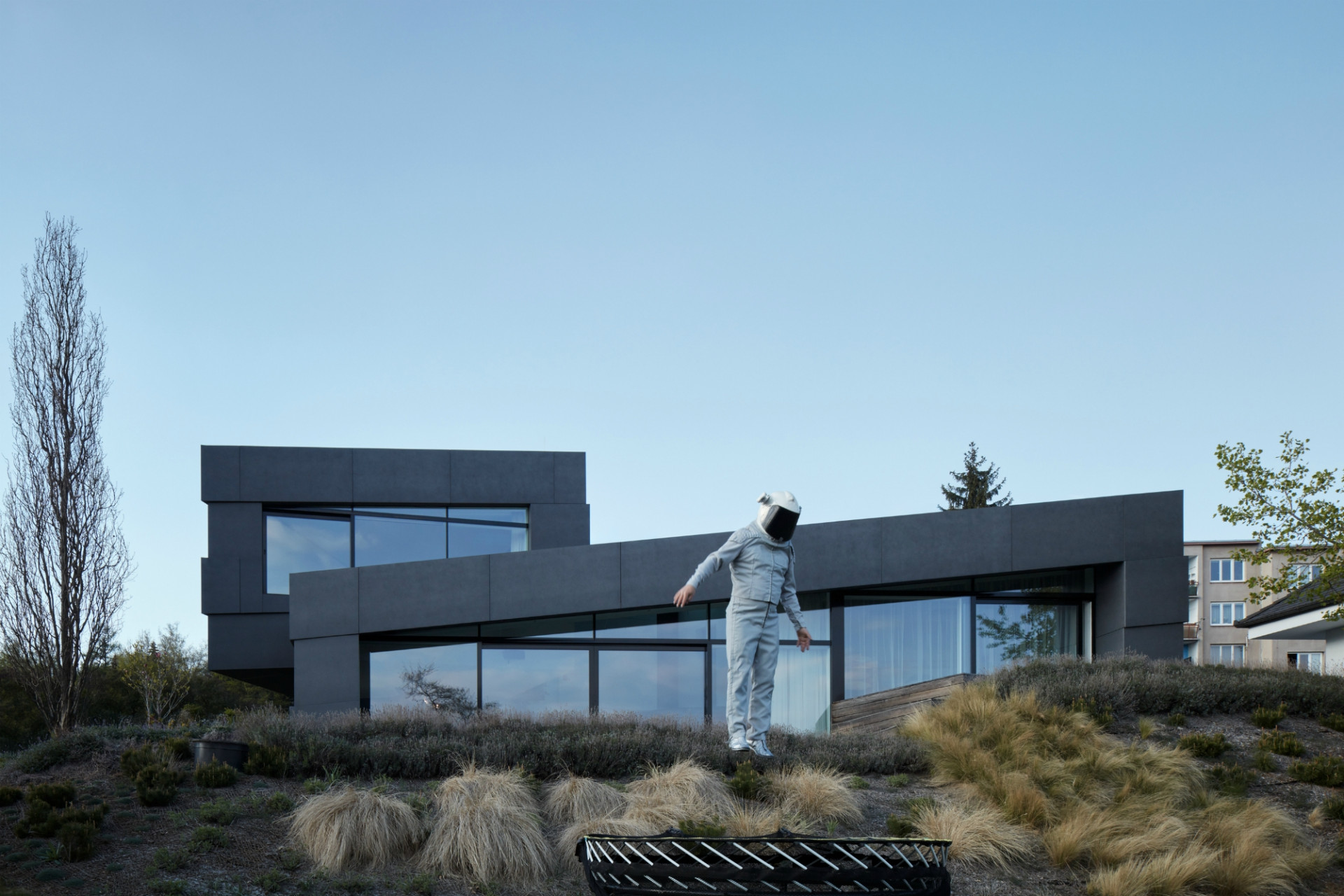 Dům je exponovaný i shora a proto kvete střecha přes rok různými barvami. Zelená střecha přispívá nejen prakticky k energetické rovnováze domu, ale i esteticky. Ornament otevírajíci se hvězdy se propisuje i do teras okolo domu a rozplývá se v zahradě.