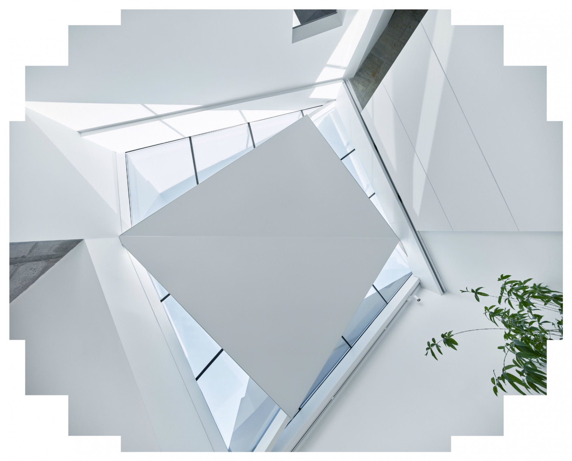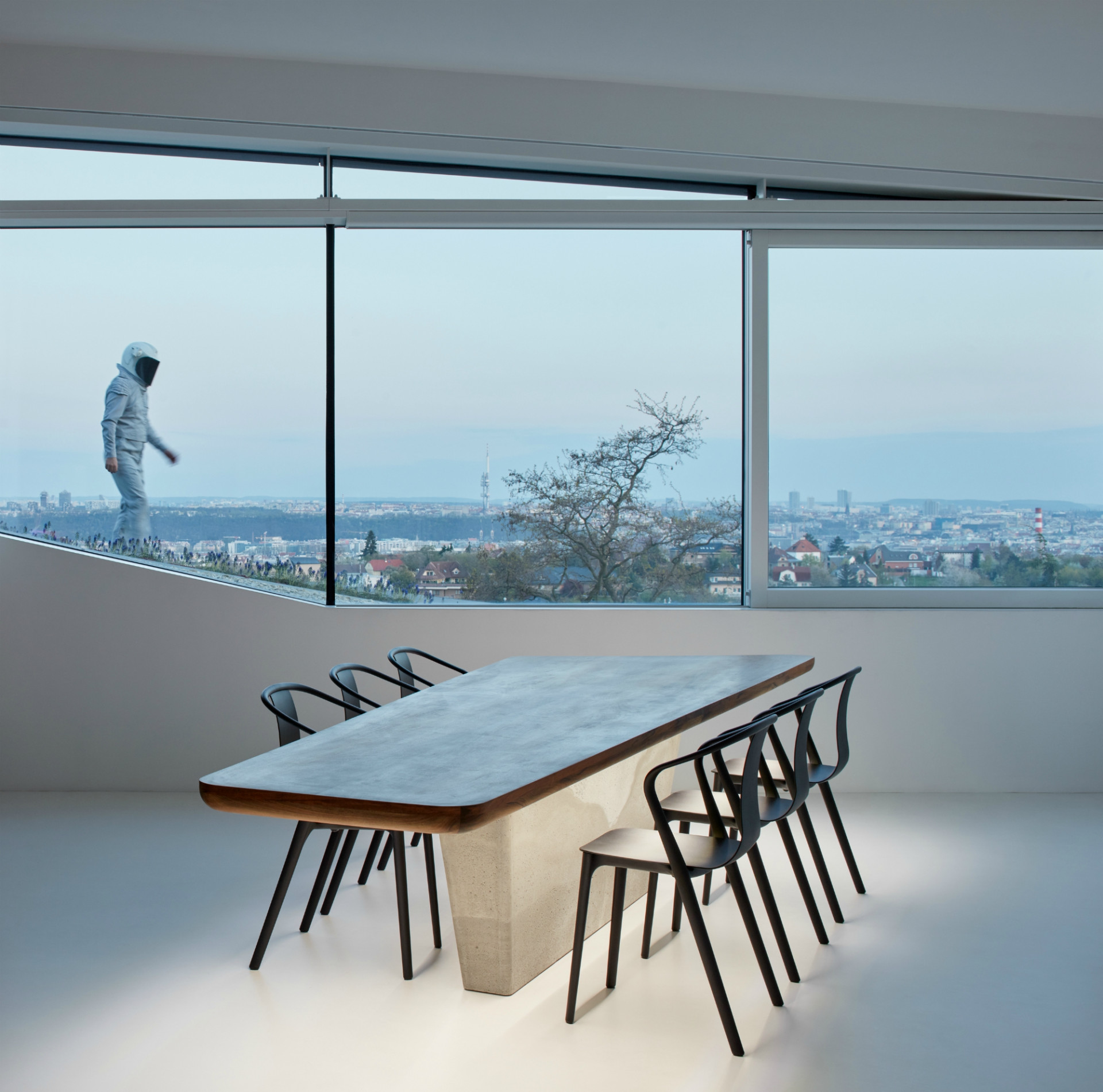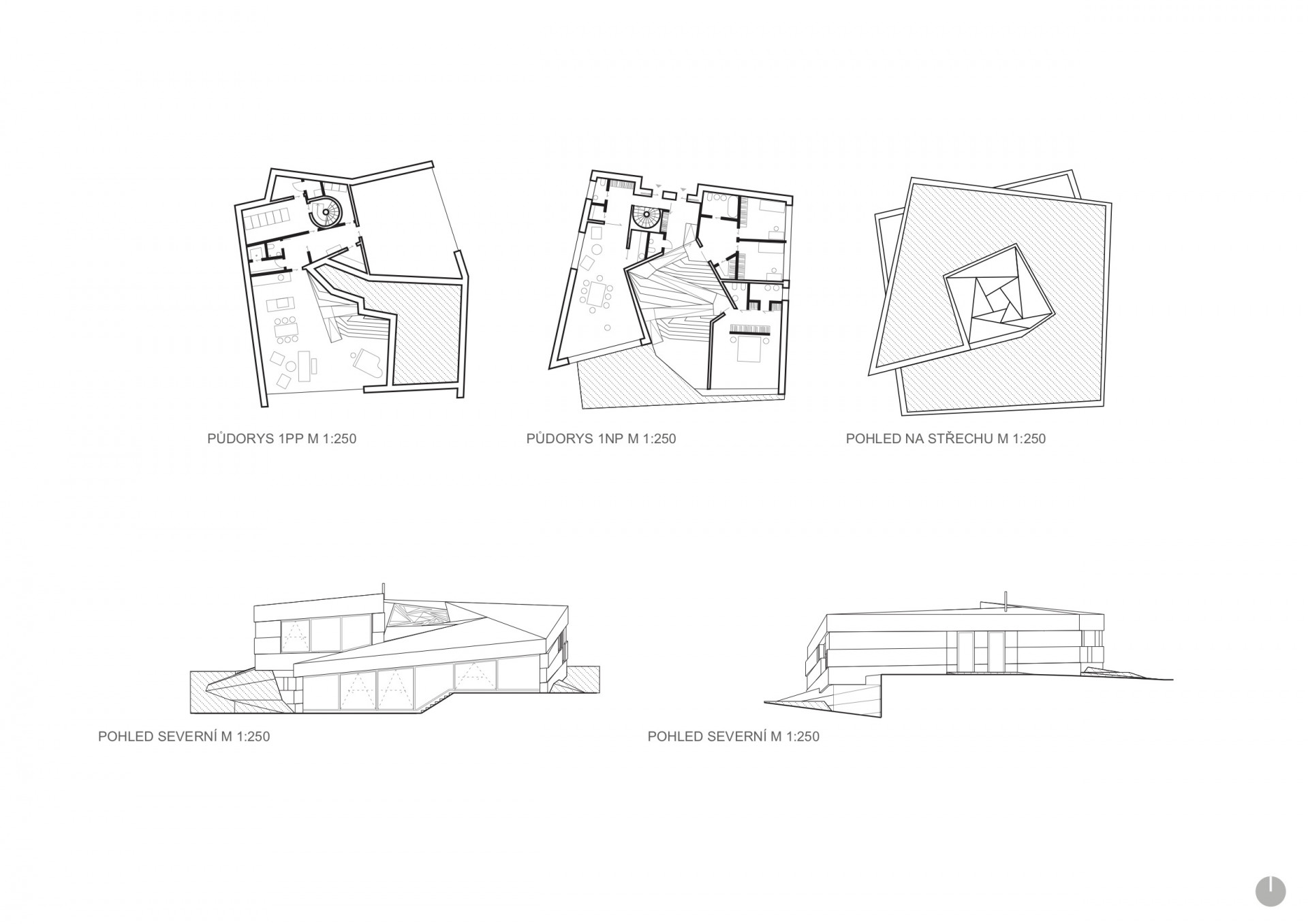 Klesající terén umožňuje, aby se dům otevřel na jih a nabídl tři základní komponované pohledy. Z obytného prostoru do zahrady, z ložnice do korun stromů a z pracovny na panorama města. Dvojvstup ze severní slepé fasády, zvlášť do obytné i pracovní sféry, slouží převážně pro návštěvníky. Pro domácí začíná dům garáží, od které se rozvíjí jeho prostorová spirála. Garáž je tak plnohodnotná součást domu a prakticky slouží jako vstupní hala. V duchu paladiánských vil je čtvercový půdorys rozdělen do 9 polí, které spirálovitě stoupají po svahu a jsou zakončeny nejveřejnějším úsekem domu, tedy pracovní částí.