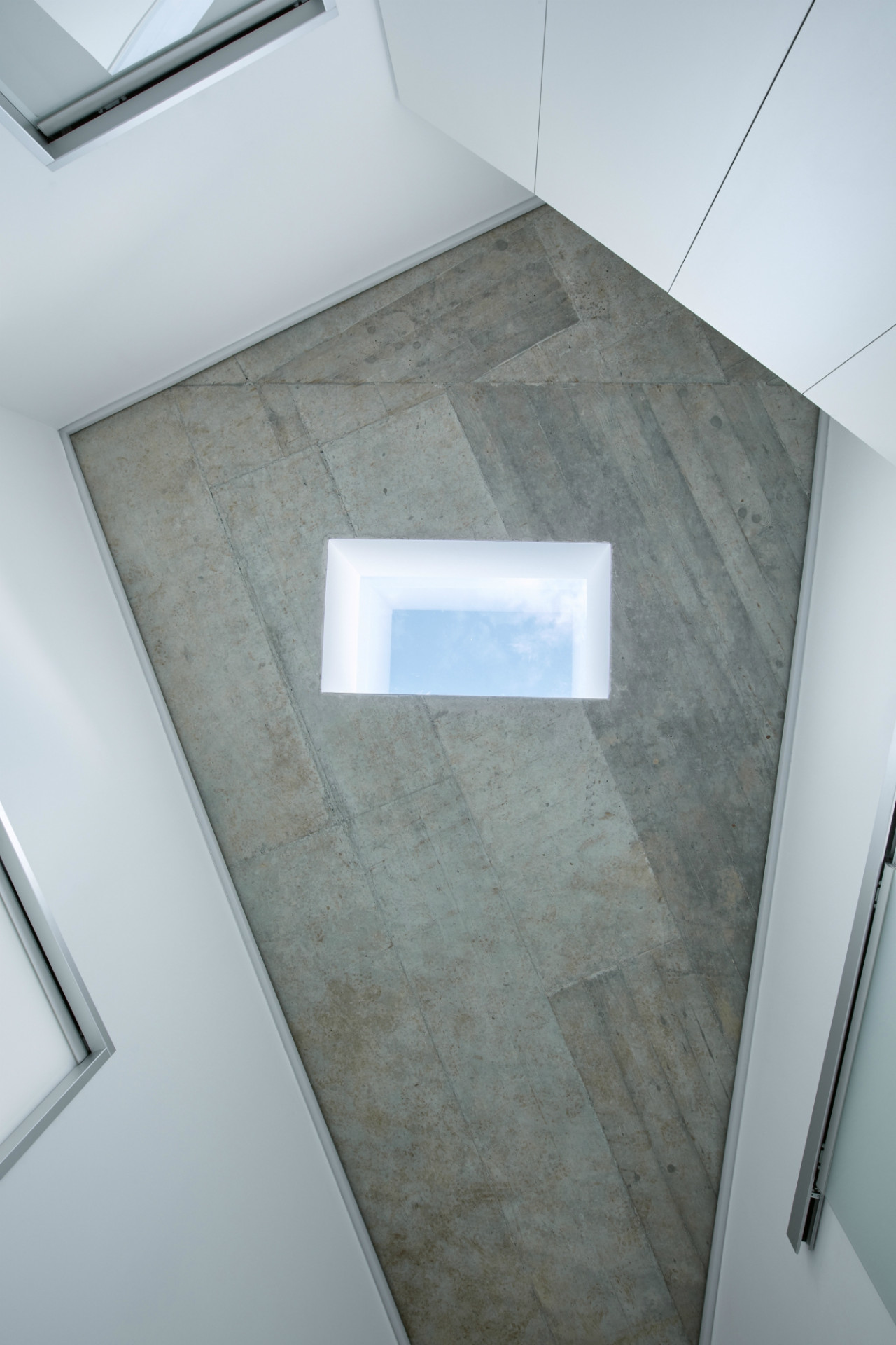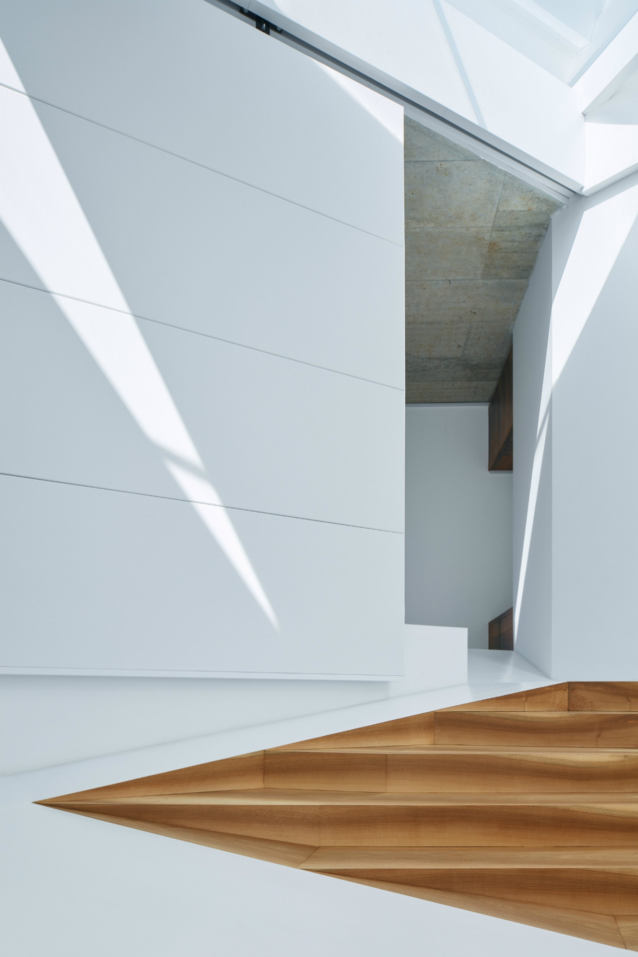 Do hlavního obytného prostoru se vchází na úrovni zahrady a centrální schodišťovou halou se po stoupajícím svahu plynule vstupuje do vyšších částí domu. Přístup pro obyvatele a hosta je antagonický. Umožňuje odlišnou zkušenost z vnímání prostoru či užívání schodištního svahu sestupem či naopak vzestupem, podle protilehlých konců spirály. Schodiště navíc křižuje bezbariérová rampa, která znovu podtrhává celkovou funkčnost domu jako celoživotního místa k bydlení, podle zadání klientů. Rozvíjí pohyb v rané fázi života a usnadňuje fungování na jeho sklonku.