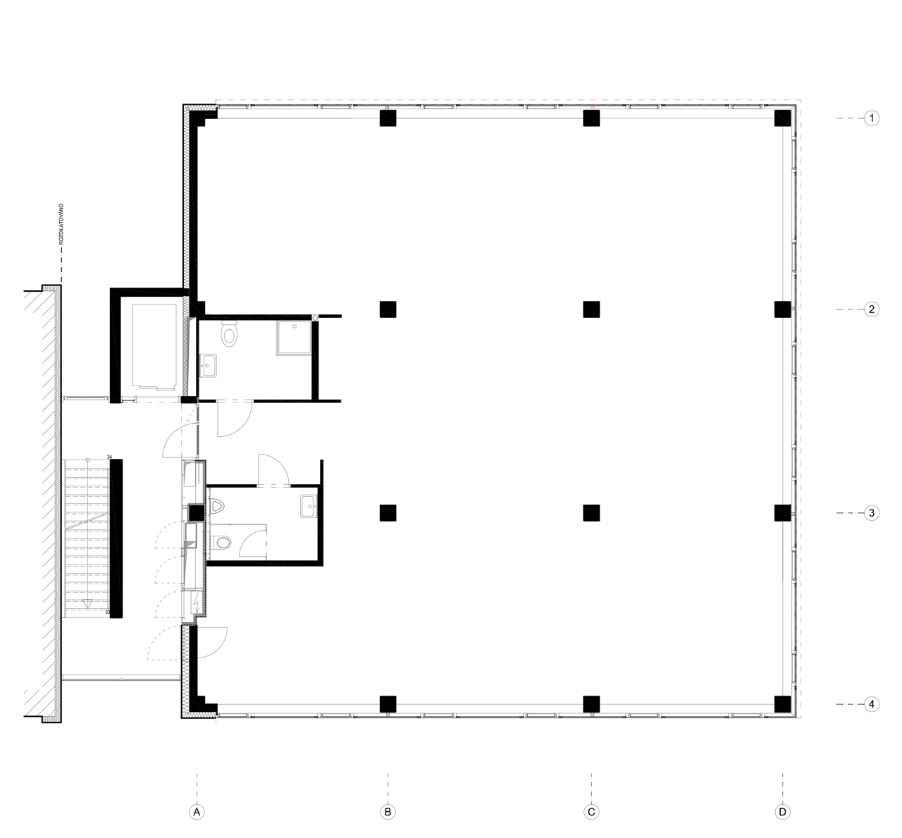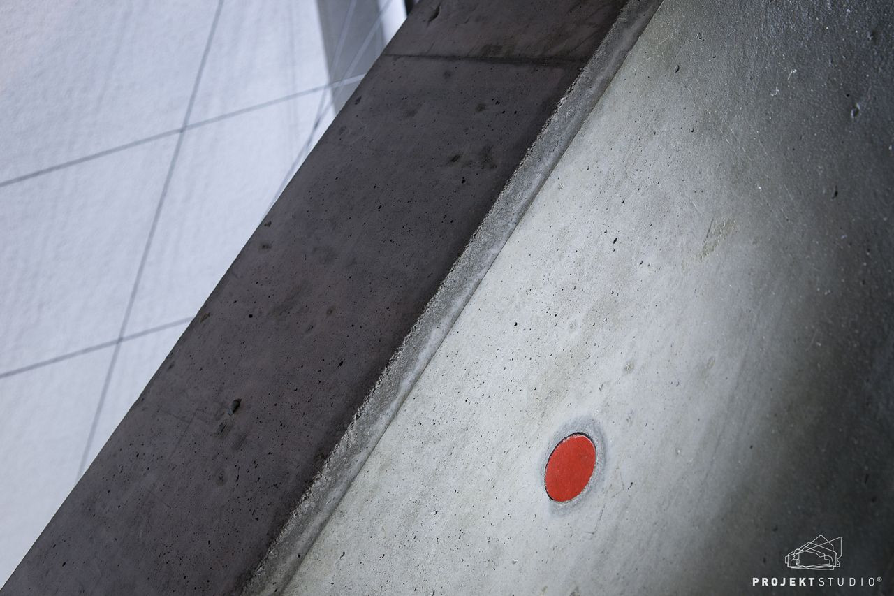 Mezi štítovou stěnu stávajícího bytového domu a půdorysnou stopu samotné novostavby jsou vloženy společné prostory v podobě schodišťové šachty. Samotný prostor je v kombinaci pohledového betonu a čirého zasklení jednotlivých podest. Záměrem je, aby stavbu bylo možné vnímat co nejvíce smysly, i proto ocelové schodiště při použití vydává charakteristické dunění ve vazbě na pohyb domem – stavba tedy má i svůj zvuk.