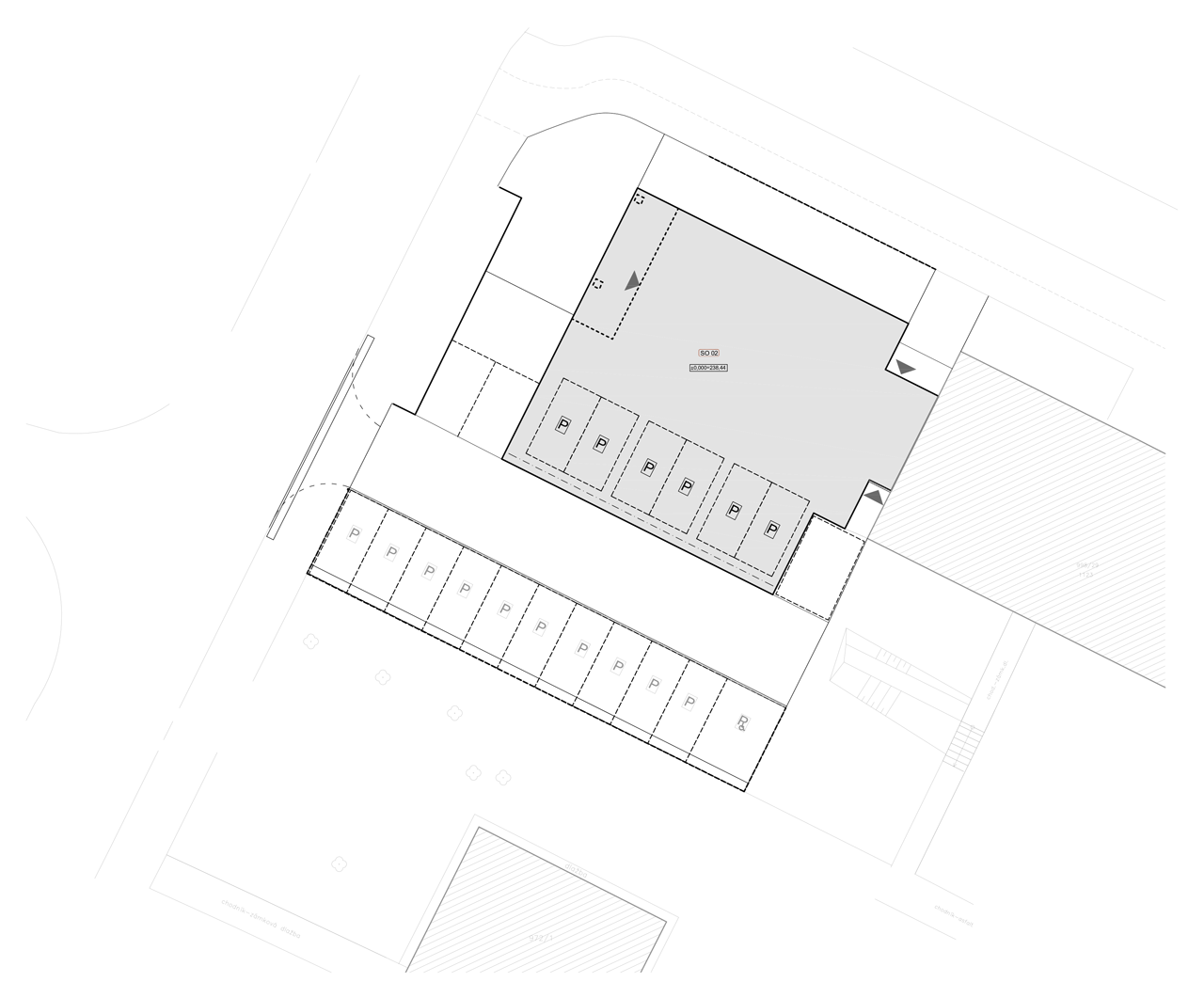 Ustupující a odlehčený parter, kde ze strany od hlavní komunikace se nachází pronajímatelný prostor pro občanskou vybavenost a vytváří tak obchodní parter, tak důležitý pro město. Ze zadní strany jsou umístěny garáže pro majitele jednotlivých pater.