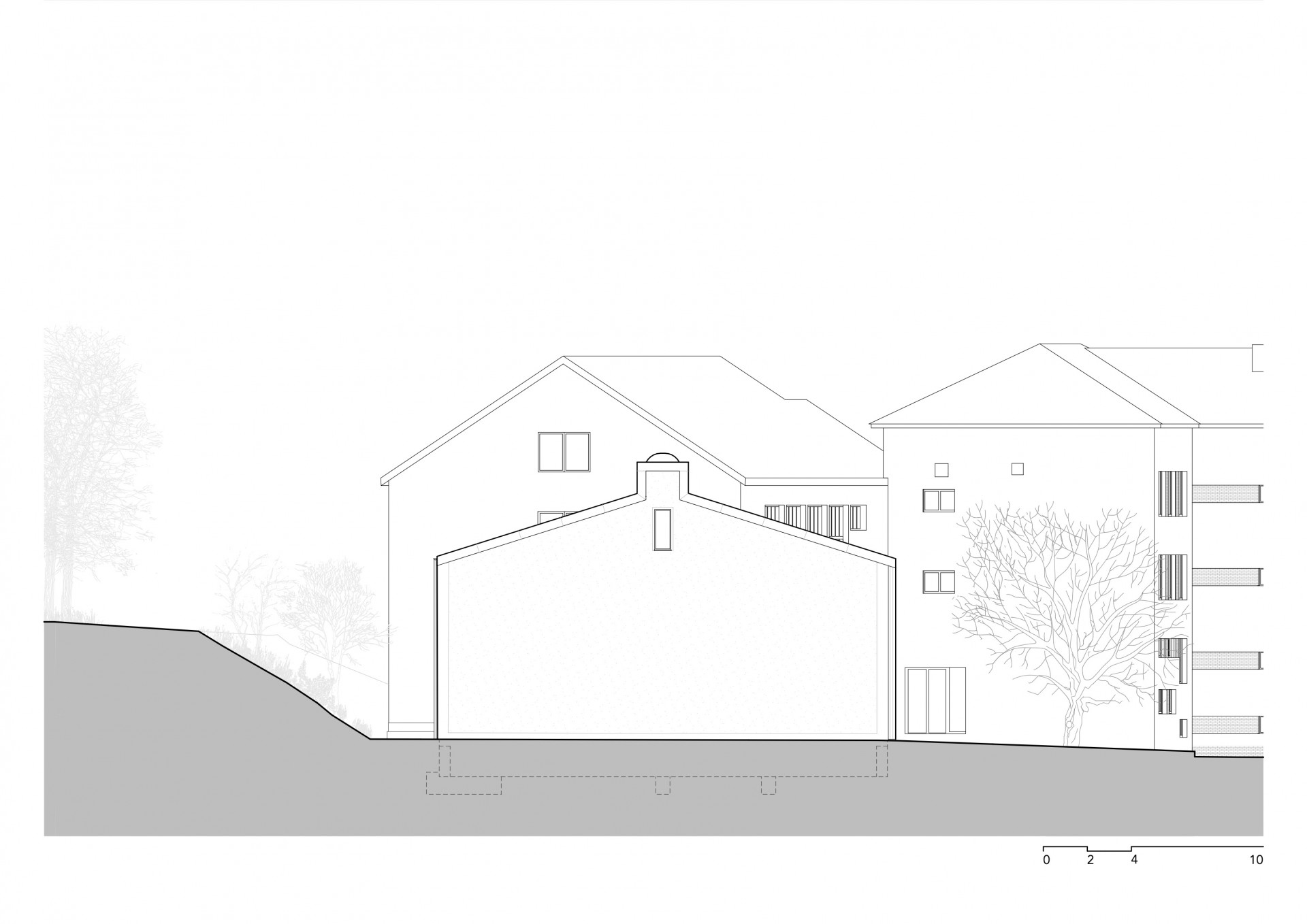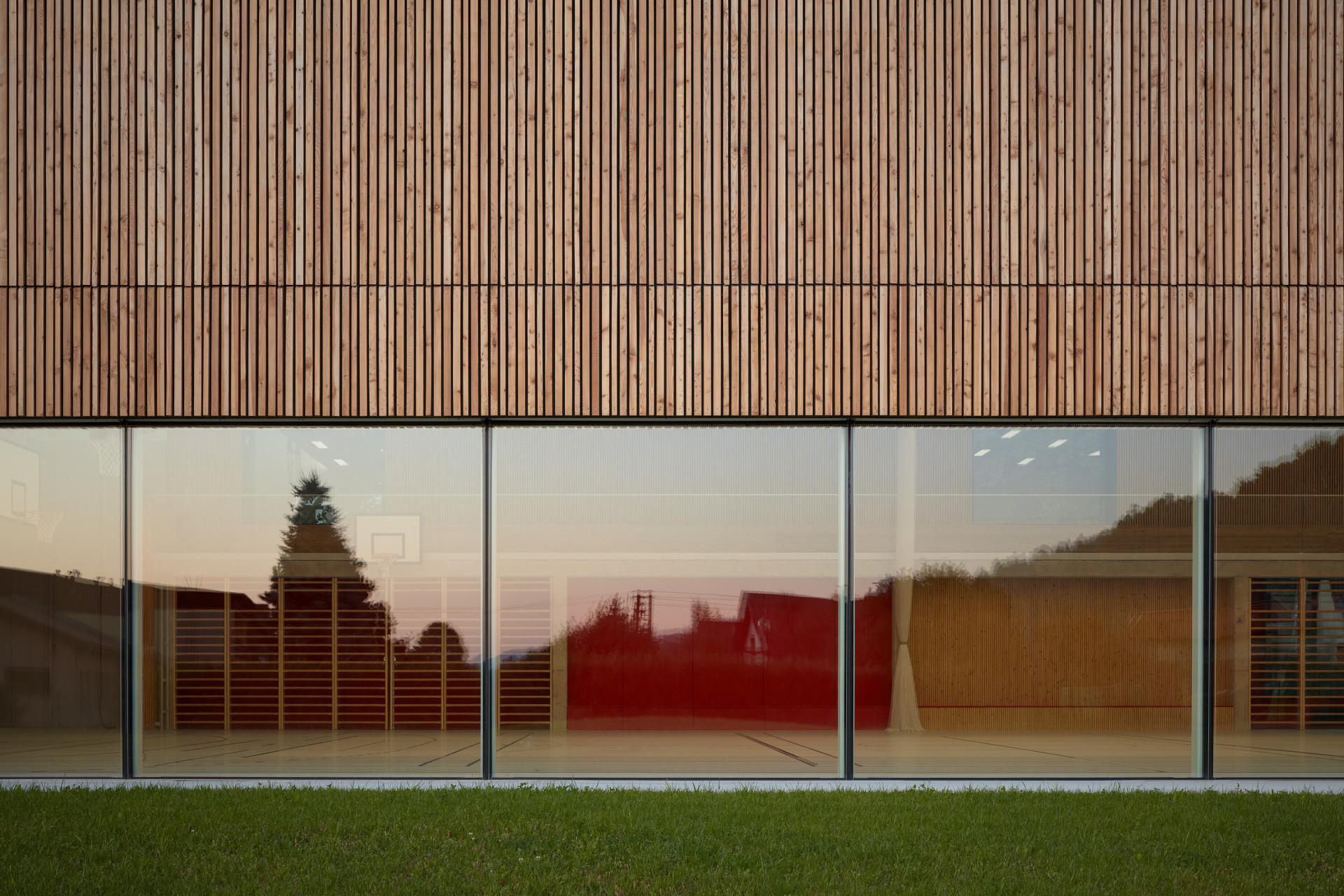 Umístěním sportovní haly mezi násyp železniční trati a budovy základní školy se vytvořil prstenec kolem vnitřního dvora a zahrady, které jsou nově přístupné ze všech školních budov novými vstupy. Základním konceptem samotné sportovní haly je propojit venkovní krajinu a vnitřní prostředí prosklenou fasádou. Prostor se nezastaví, ale plyne dál do krajiny, která se v čase mění. Pohled oběma směry, zvenčí dovnitř a obráceně, dává vzniknout novým interakcím a je důležitou součástí konceptu. Orientace prosklené fasády přináší atmosféru zapadajícího slunce po dlouhé večerní hodiny. Interiér se tak stává útulnější. Bez osvětlení je splynutí s krajinou více intenzivní a nabízí intimní chvilky vhodné pro meditaci, jógu a tanec. Při nasvícení interiéru naopak nabízí skvělou podívanou zvenčí. Dopolední hodiny jsou v režii žáků a jejich učitelů.