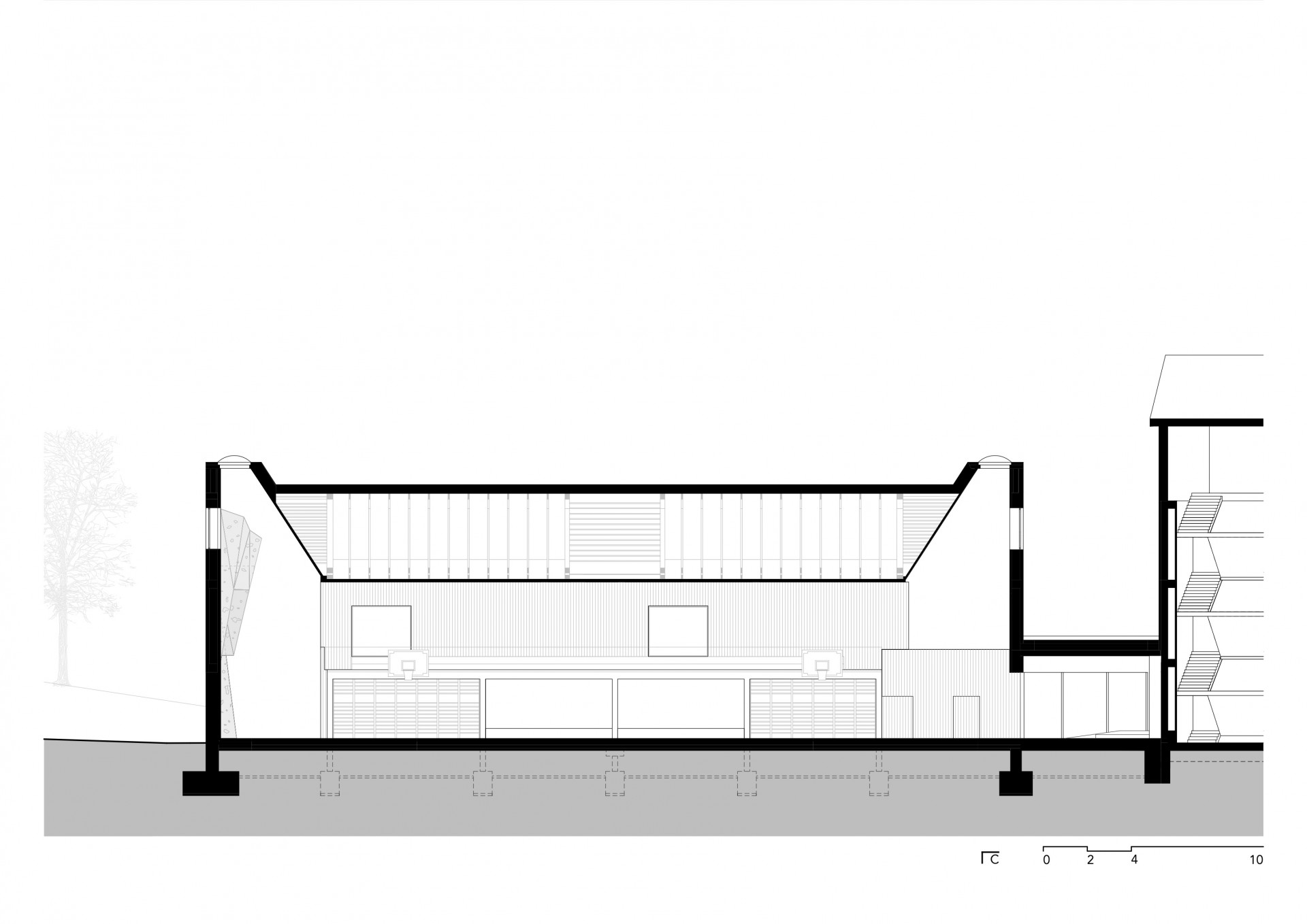 Východní stěna haly má tři velkorysá okna, které rámují cílené pohledy ven i dovnitř. Nejnižší okno láká veřejnost k nahlédnutí a jeho vnitřní kovové lemování slouží k posezení necvičících žáků. Další dvě okna jsou přístupná z vnitřní tribuny a lze jimi dohlédnout na centrum obce nebo sledovat projíždějící vlaky. Celému prostoru vévodí velkorysá lezecká stěna vytažená nad podhled s horním světlíkem. Při zdolání stěny mohou lezci pohlédnout do krajiny úzkým oknem ve štítu. Druhý světlík dotváří celou kompozici. Venkovní rohy těchto světlíků zvědavě vystupují nad střechu a rozehrávají jinak rigidní formu haly. Snaha zapadnout ale i vyčnívat se tak mísí v celém návrhu, který se pokouší o novou otevřenou typologii sportovní haly. Budova svou architekturou podporuje a inspiruje místní komunity a jejich děti. Po několika měsících provozu se začínají plnit sportovní kluby a vznikají nové, například lezecký kroužek.