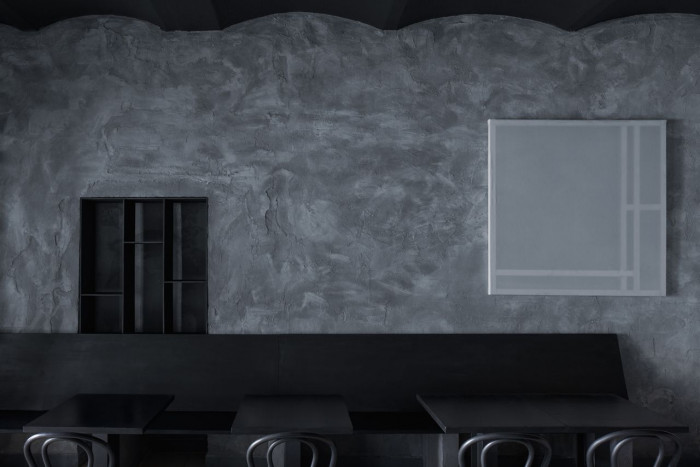 Původní židle, nové stoly svařené z I profilů a ostatní kusy nábytku byly sjednoceny do odstínu kovářské černi.