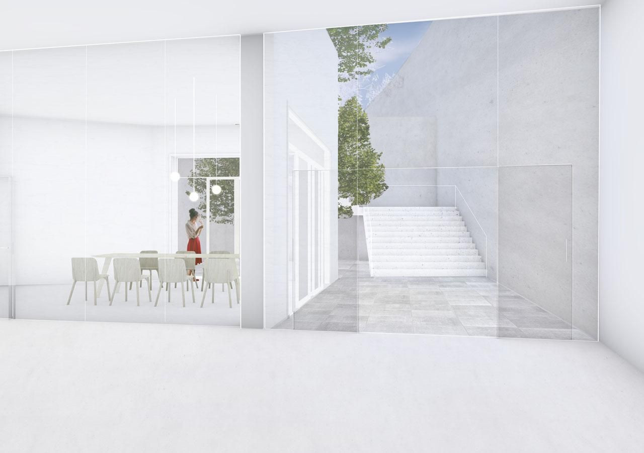 Druhá polovina podlaží je spíše klidová a odpočinková. Nachází se zde kruhové atrium, které nabízí příjemnou atmosféru pro lehké občerstvení nebo odpočinek s kávou. Pro tyto účely se zde nachází kuchyňka se skládkem potravin a také místnost s kávovarem, která je vybavena křesly a pohovkami. Tento prostor je koncipován jako přirozené prostředí pro setkávání coworkerů, kteří mají zájem navázat nové vztahy a kontakty, na jejichž základě je možnost spolupracovat na nových projektech. O podlaží výše se nachází náměstí s malou kavárnou, ze které je též výhled na protější břeh řeky a celé údolí. Vizuální clona, která odděluje náměstí od frekventované silnice, tvoří lehká konstrukce pergoly, porostlá popínavými rostlinami. Pergola vytváří příjemný stín a spolu s rostlinami dodává celému náměstí svěží atmosféru.
