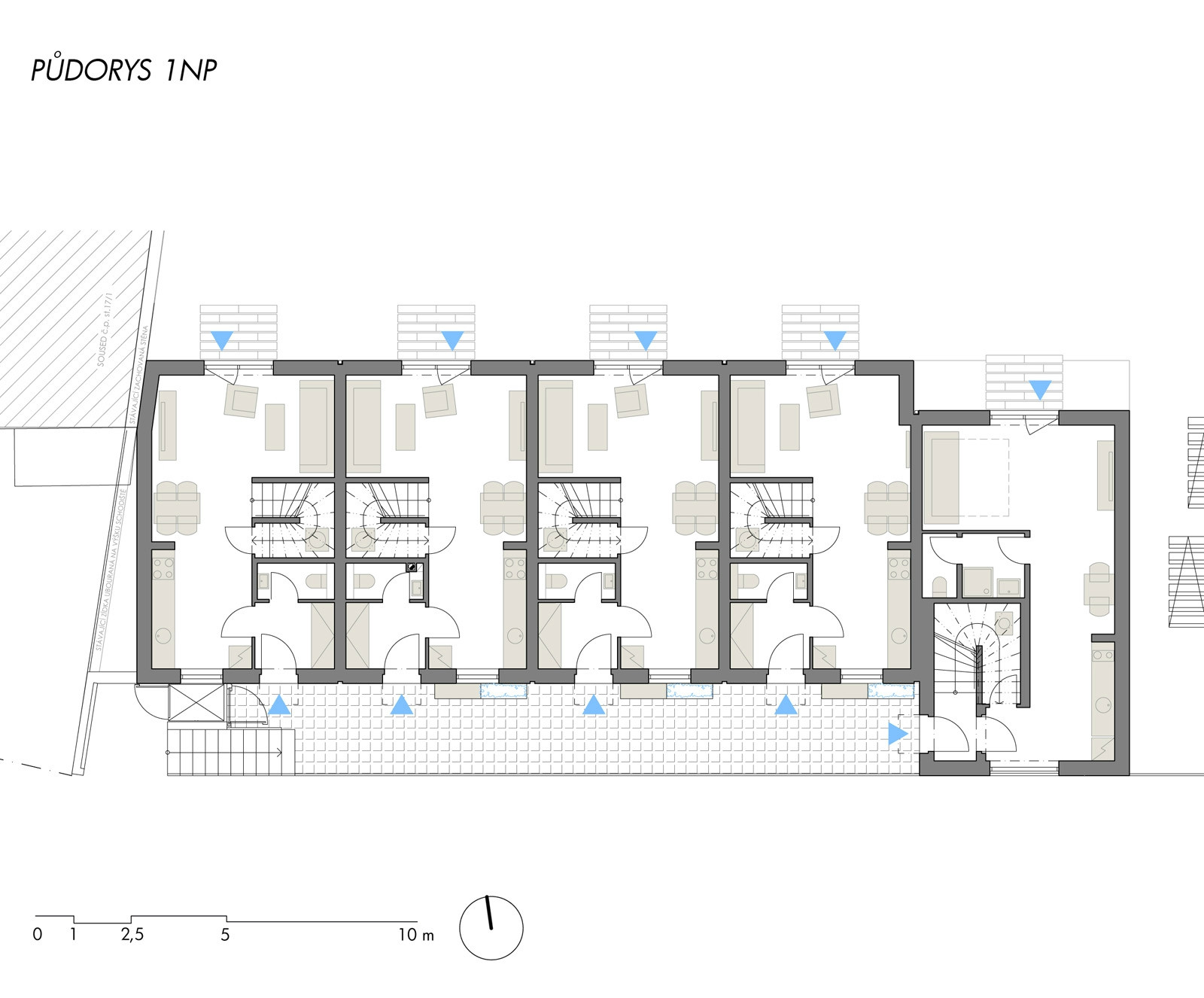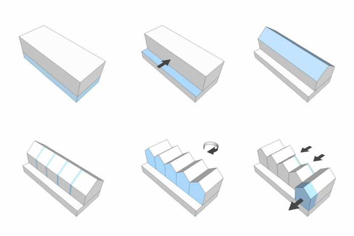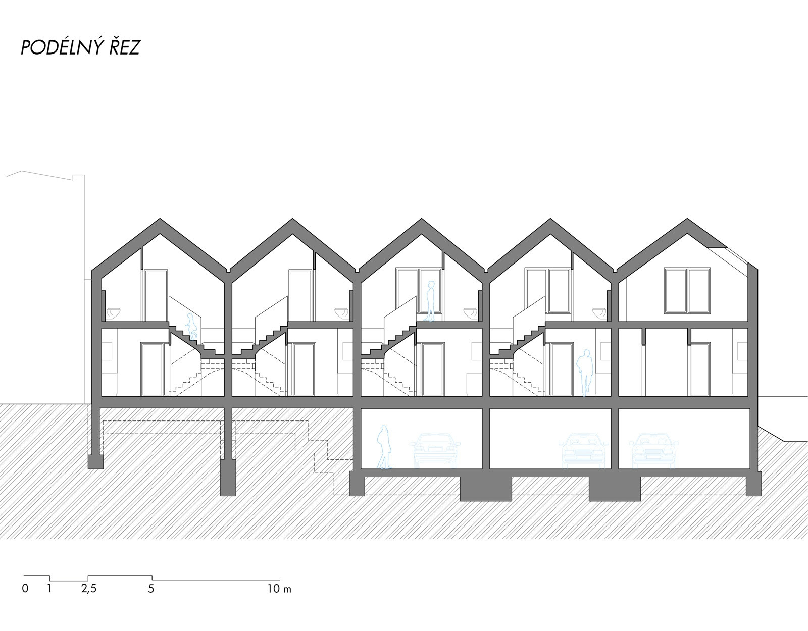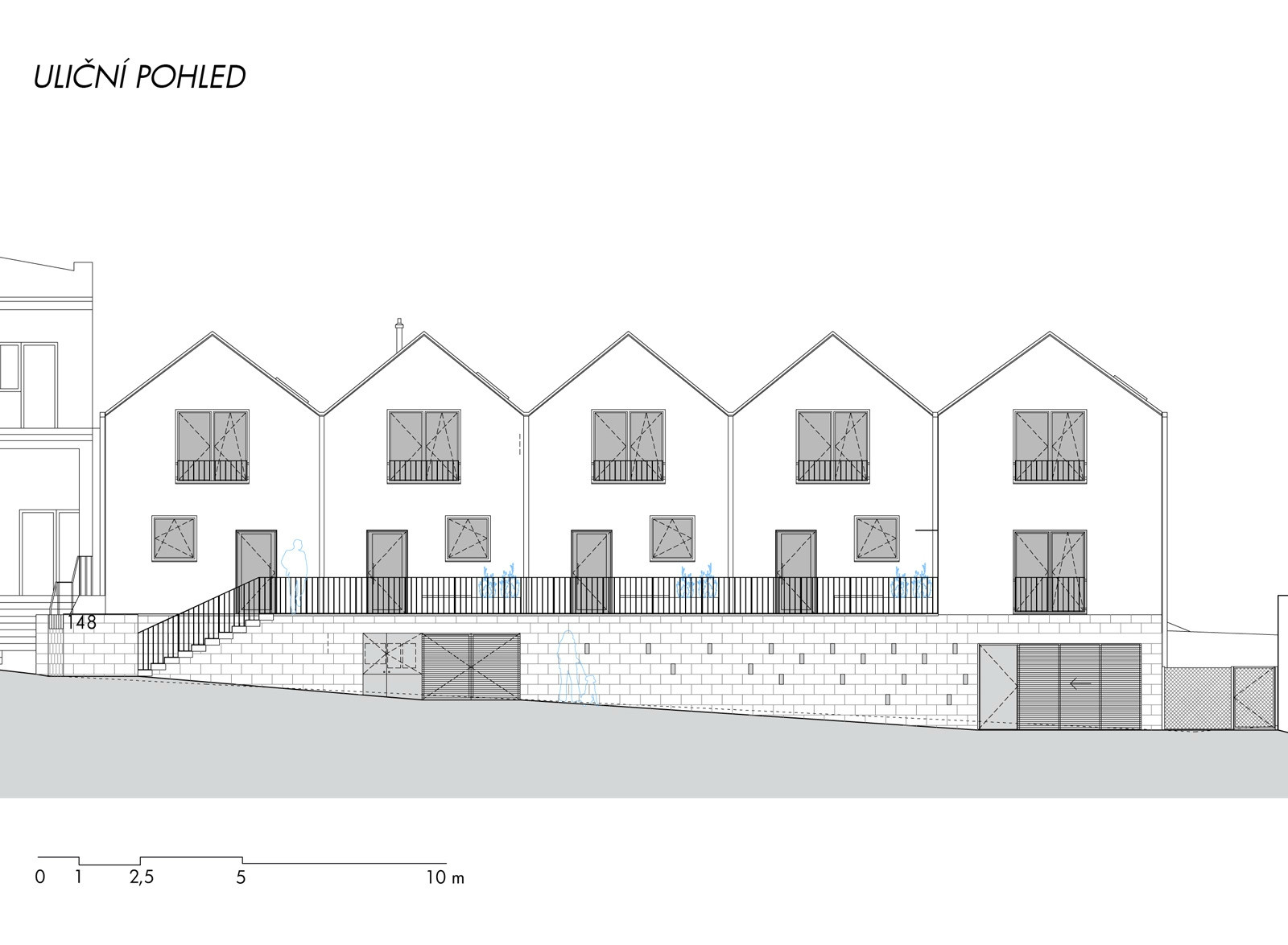 Do polozapuštěného suterénu přístupného z ulice jsme umístili technické zázemí a garáže. Z této platformy vyrůstají jednotlivé domy - byty ustoupené o pavlač. Tuto pavlač jsme záměrně rozšířili a vytvořili z ní nejen komunikaci k jednotlivým vstupům do bytů, ale i poloveřejný prostor, který slouží k vzájemné interakci mezi obyvateli jednotlivých bytů. Obyvatelé se zde mohou setkávat se svými sousedy a vytvořit tak vzájemné vazby a vztahy. Interakci podporují i u vstupů umístěné lavičky s květinovými truhlíky, které si obyvatelé mohli sami osázet. Zároveň tyto bloky vytváří odstup od oken z kuchyní, orientovaných do pavlače.