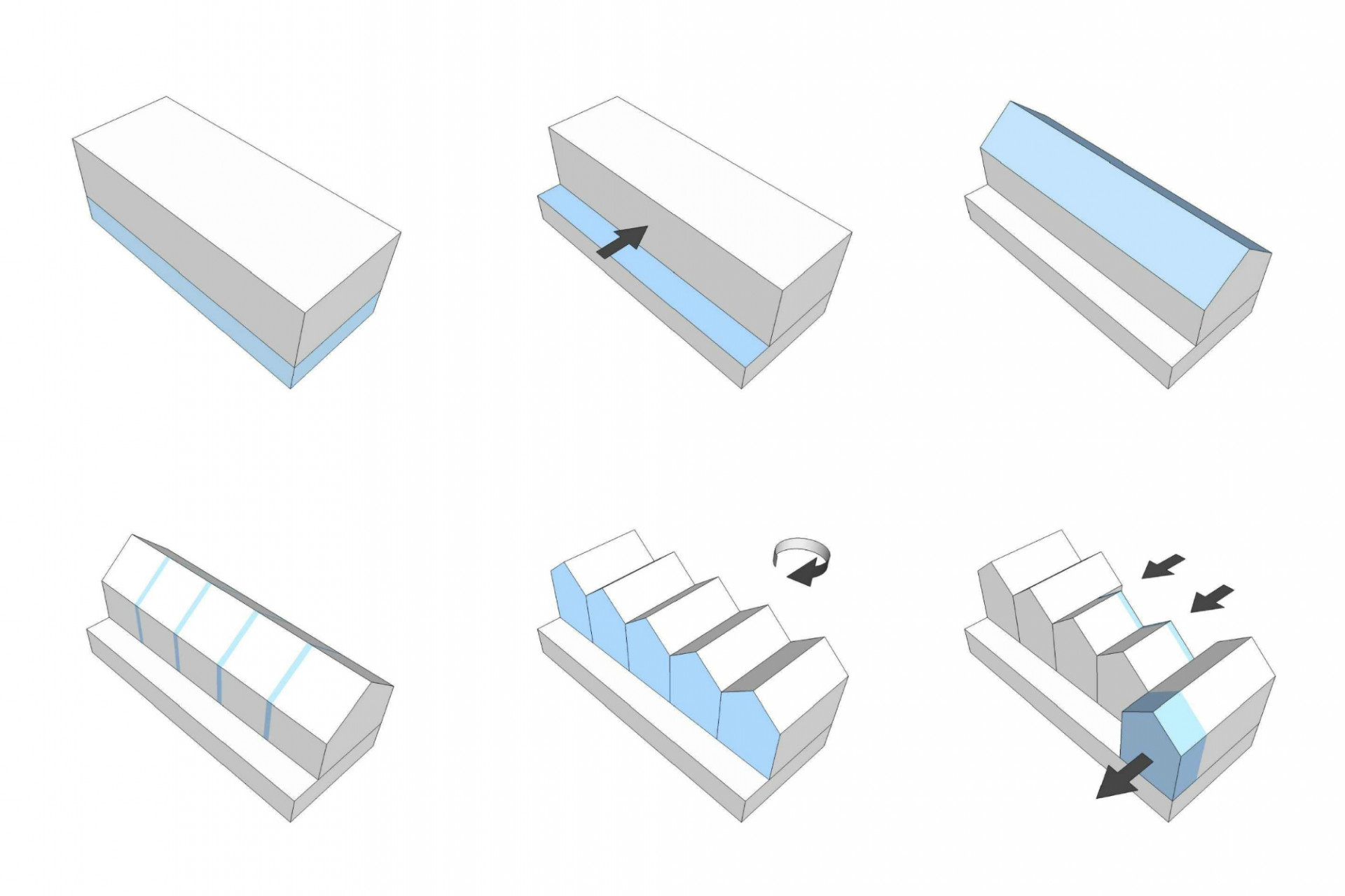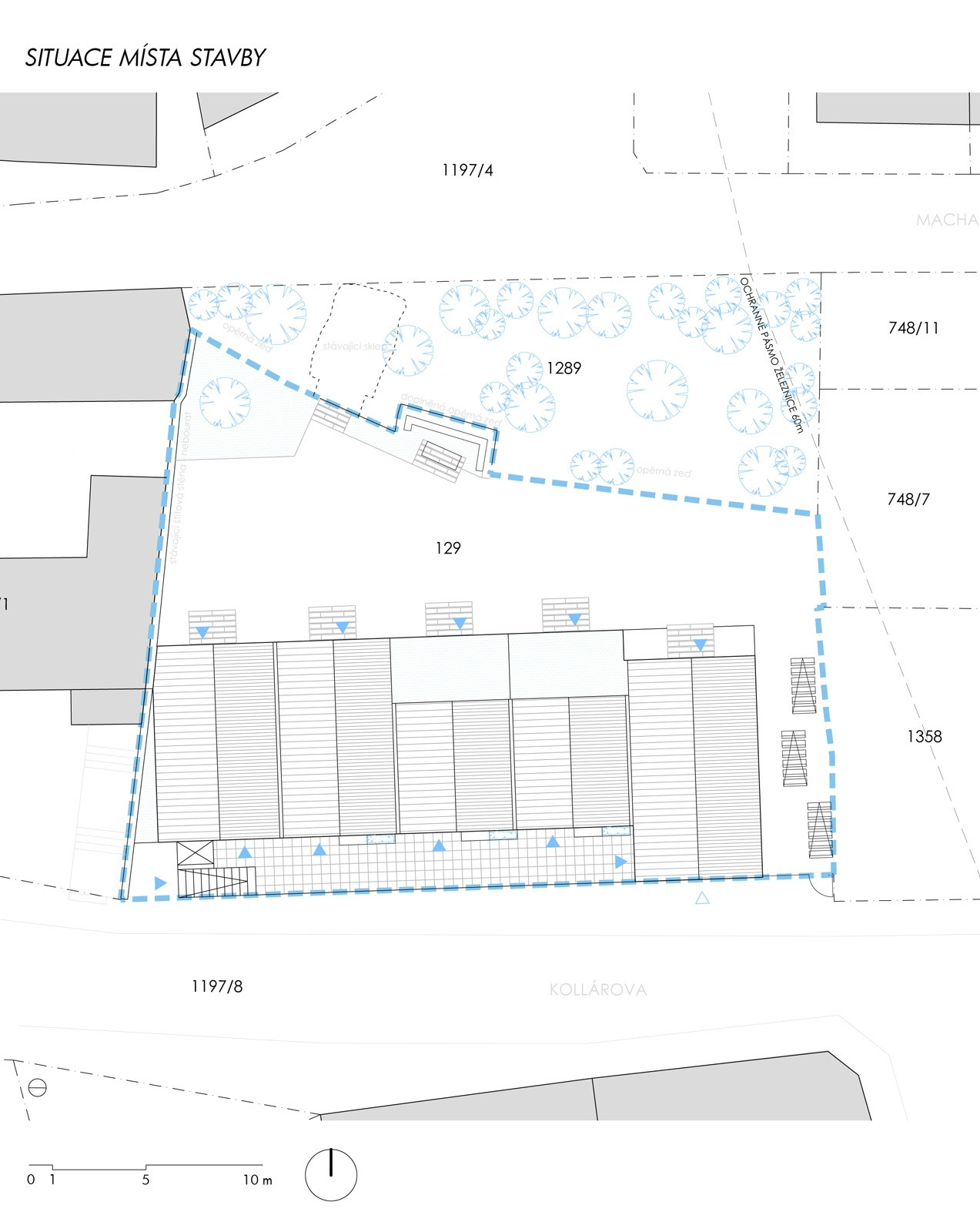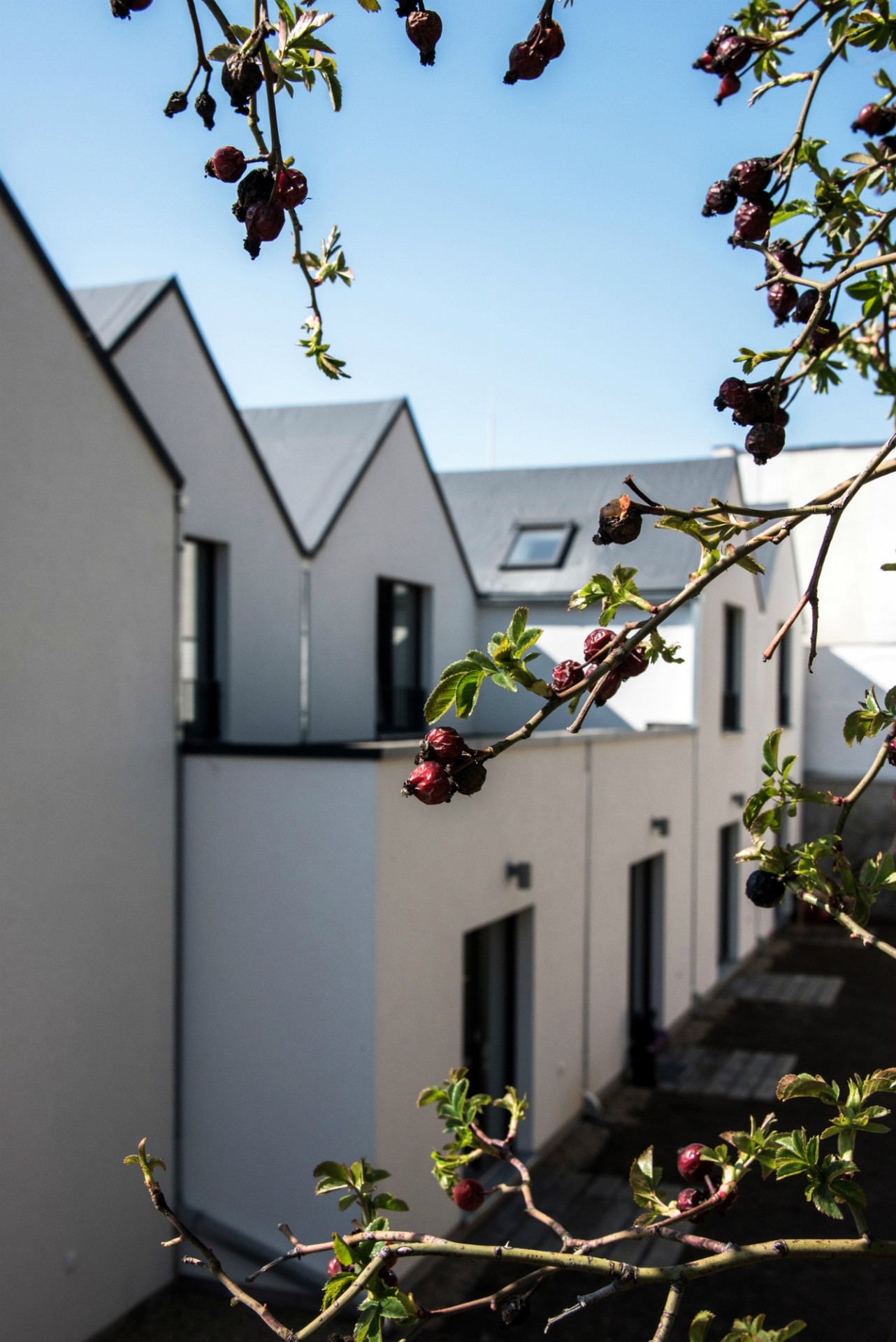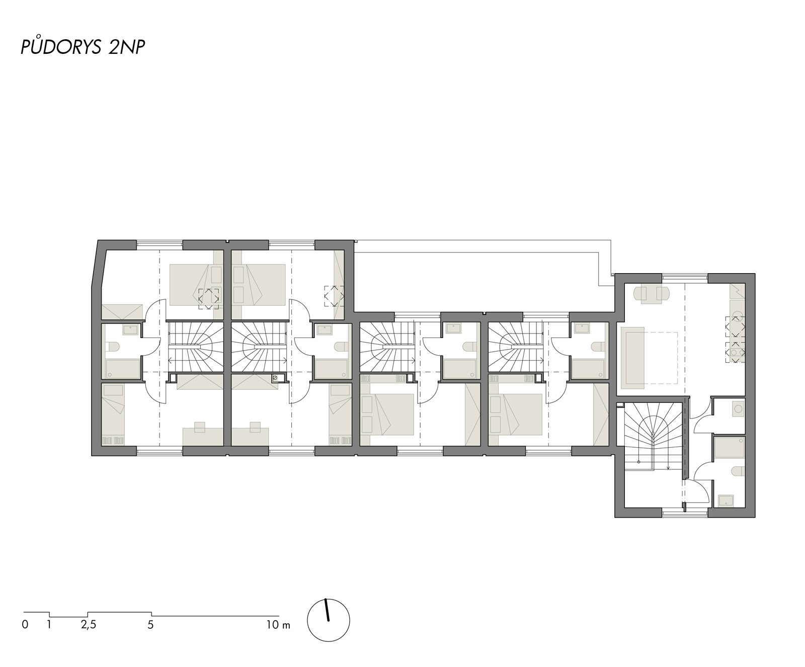 Do polozapuštěného suterénu přístupného z ulice jsme umístili technické zázemí a garáže. Z této platformy vyrůstají jednotlivé domy - byty ustoupené o pavlač. Tuto pavlač jsme záměrně rozšířili a vytvořili z ní nejen komunikaci k jednotlivým vstupům do bytů, ale i poloveřejný prostor, který slouží k vzájemné interakci mezi obyvateli jednotlivých bytů. Obyvatelé se zde mohou setkávat se svými sousedy a vytvořit tak vzájemné vazby a vztahy. Interakci podporují i u vstupů umístěné lavičky s květinovými truhlíky, které si obyvatelé mohli sami osázet. Zároveň tyto bloky vytváří odstup od oken z kuchyní, orientovaných do pavlače.