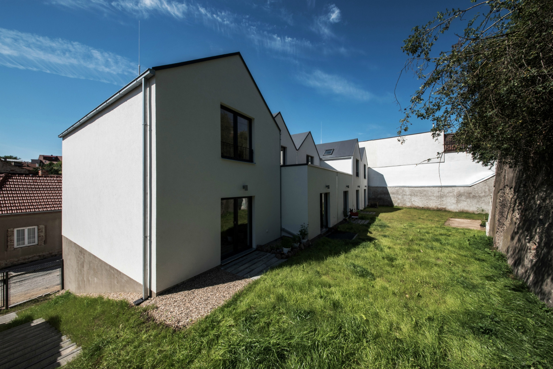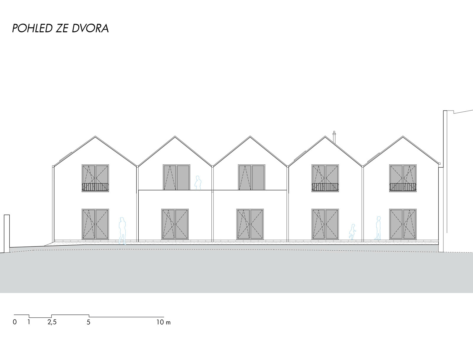 S respektem k charakteru lokality má objekt sedlové střechy, tvar, který se vyskytuje všude v okolí. Drobnějšího měřítka jsme dosáhli otočením jednotlivých domů štíty do ulice. To jednak umožnilo dostat střešními okny slunce do zadních, horních místností a tím zajistit nutné proslunění bytů a zároveň dalo celému souboru dynamiku a přívětivý charakter. Jednotlivé byty - domy jsou logicky členěny i navázány na pavlač. U venkovního schodiště jsou větší, dva třípokojové byty, uprostřed menší, dva dvoupokojové (s budoucí možností rozšíření pokoje na terasu) a v koncové části jsou nad sebou dvě garsoniéry. Tím se na pavlači logicky rozmělňuje provoz i pohyb osob.