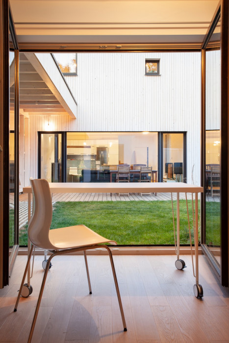 Posuvná vrata nechávají proudit zahradu kolem domu. V případě potřeby je však možné je uzavřít a vytvořit tak z dvora intimnější zákoutí. Skrze velké prosklené stěny zůstávají obě části domu pocitově propojené. Dvůr se tak stává přirozenou součástí interiéru.