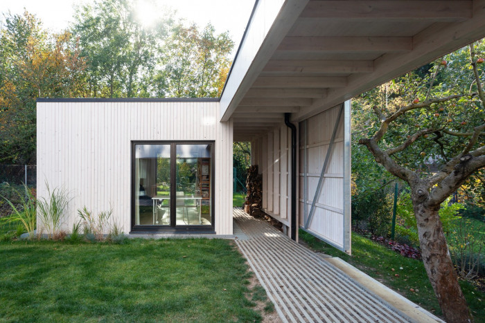 Pracovna má vlastní zázemí a ve volných chvílích slouží jako samostatný hostinský pokoj. S obytnou částí je spojena krytou pěšinou s prkenným hrazením a posuvnými vraty. Cesta přes dvůr a zpět dává obyvatelům nový vjem, vytváří z pracovny klidné místo pro práci.