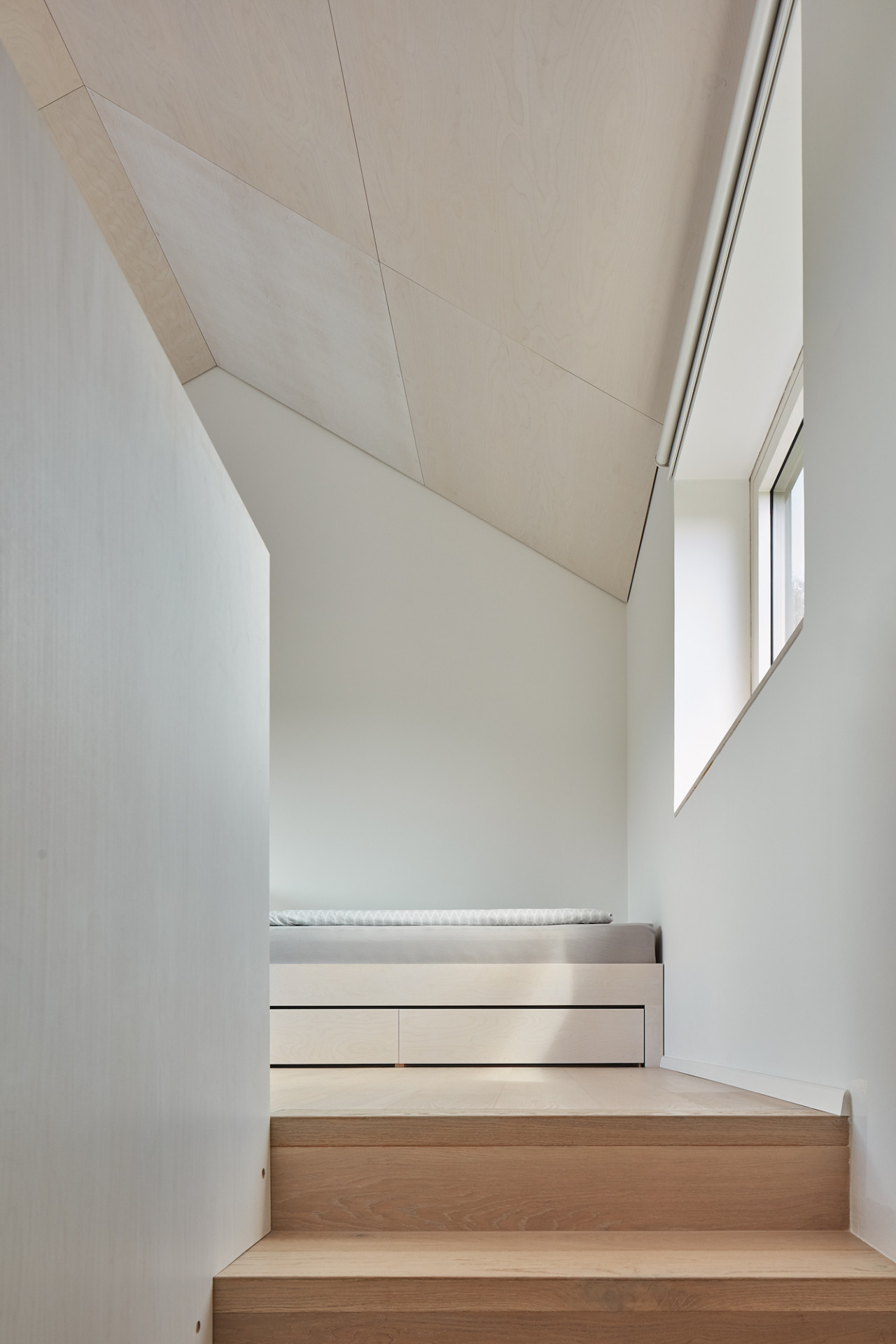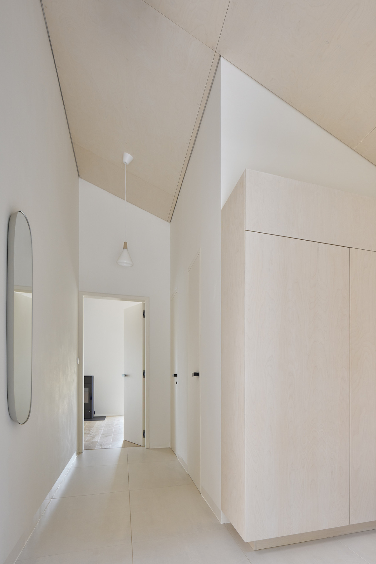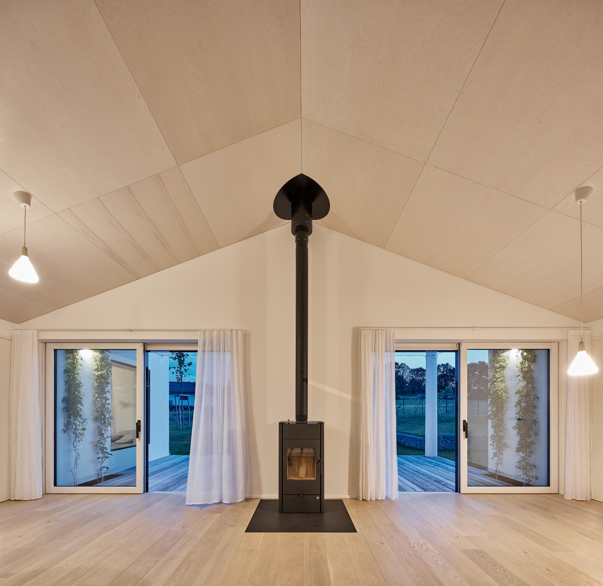 Dům je poskládán z několika menších, na sebe navazujících objemů, z nichž každý slouží jinému účelu. Celá rodina se schází v centrální části domu, kde je obývací pokoj s krbem, jídelna a kuchyně. Tento prostor je srdcem domu a díky velkým posuvným oknům je otevřen do zahrady.
