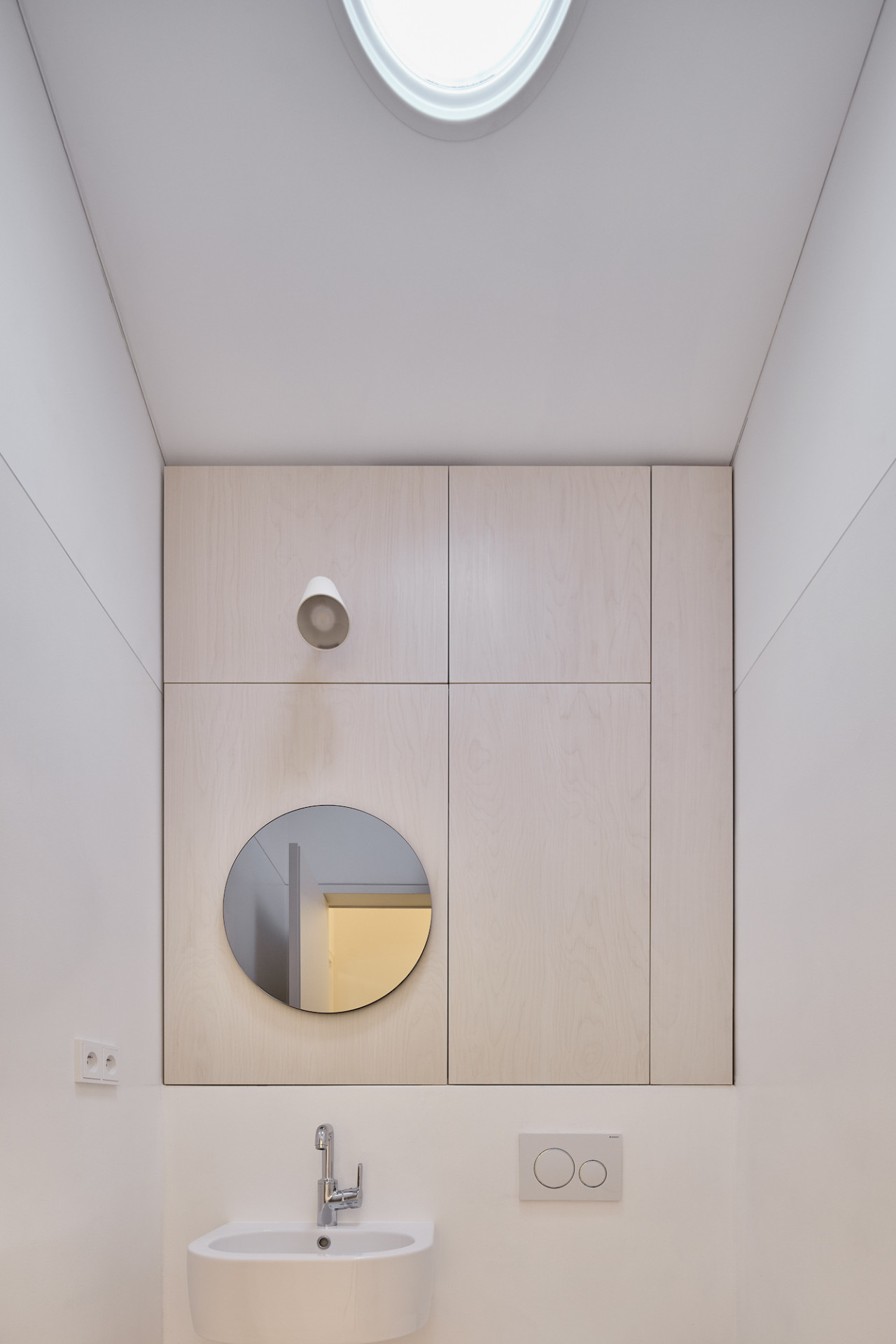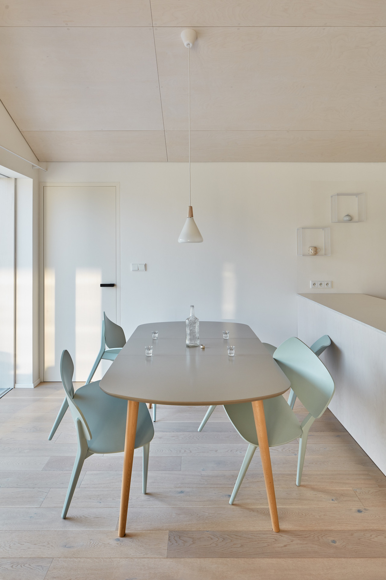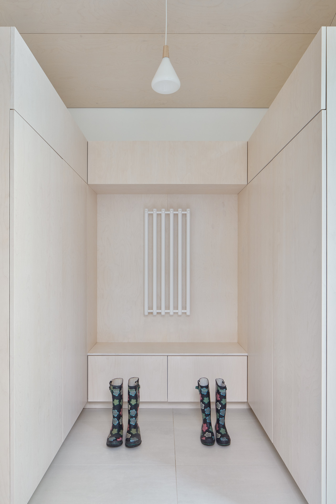 Dům je poskládán z několika menších, na sebe navazujících objemů, z nichž každý slouží jinému účelu. Celá rodina se schází v centrální části domu, kde je obývací pokoj s krbem, jídelna a kuchyně. Tento prostor je srdcem domu a díky velkým posuvným oknům je otevřen do zahrady.