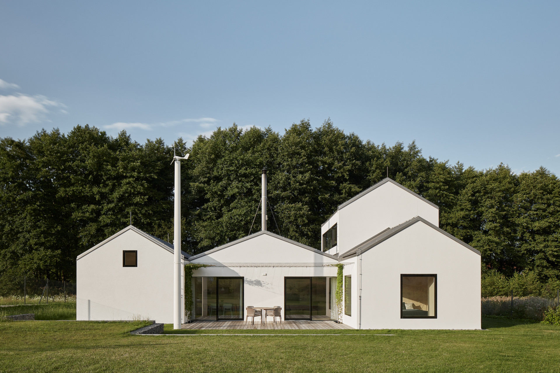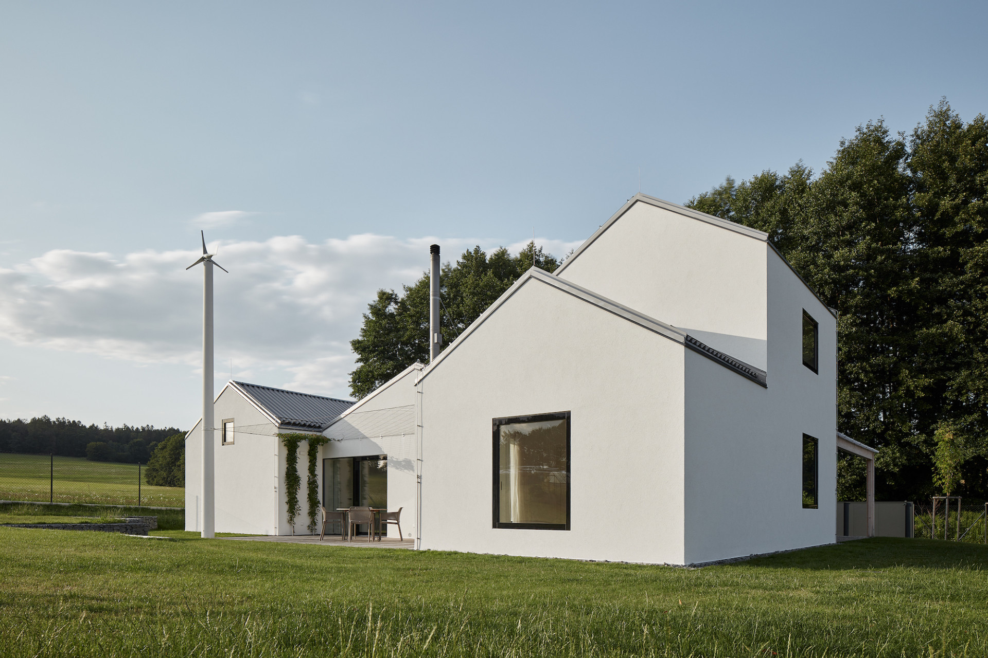 Na stavbu navazuje jižní terasa, v jejímž rohu se tyčí vysoký sloup. Na něj je kotveno lanoví zelení porostlé pergoly, je tu i zahradní sprcha a na špičce se točí vrtule malé větrné elektrárny.