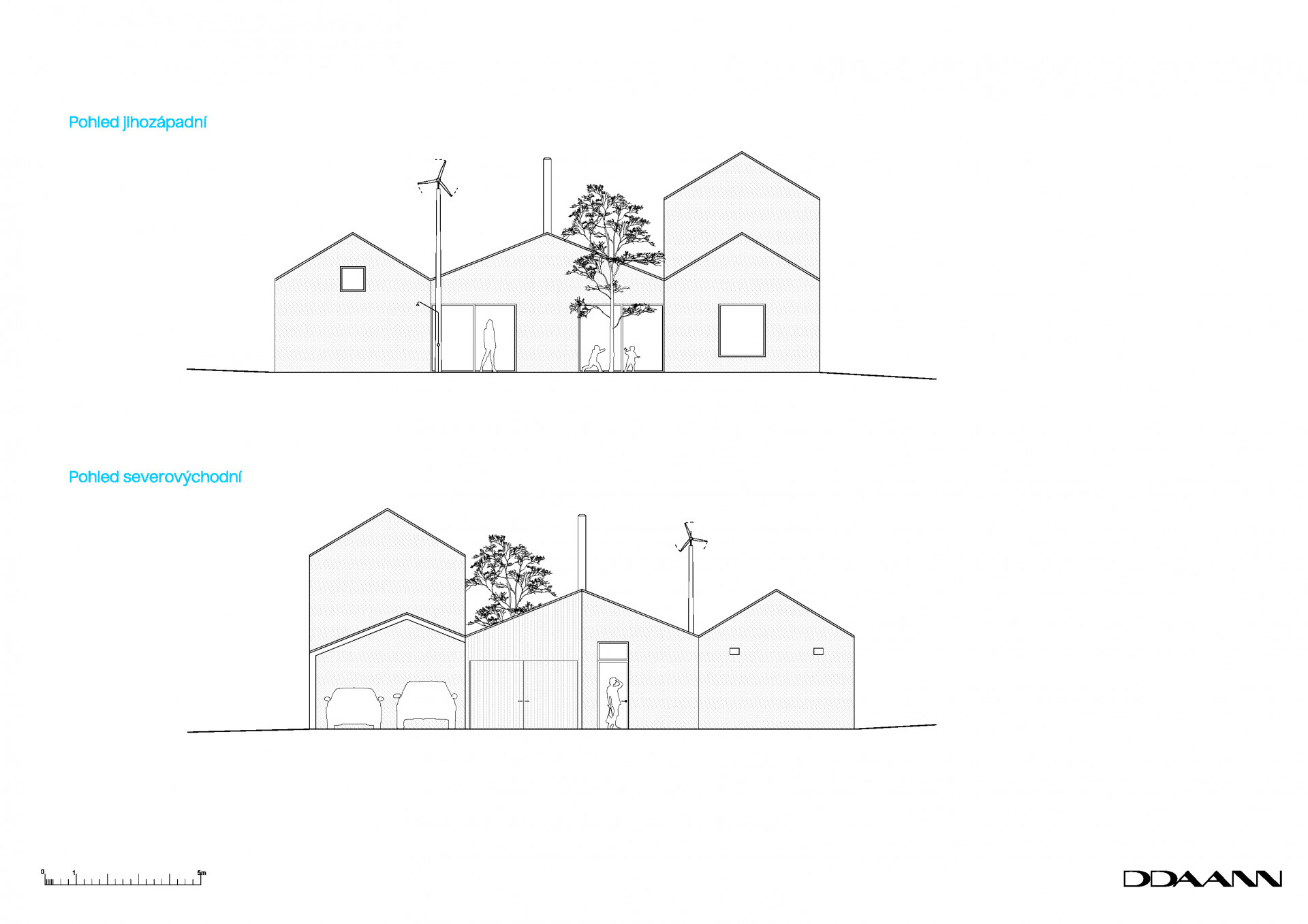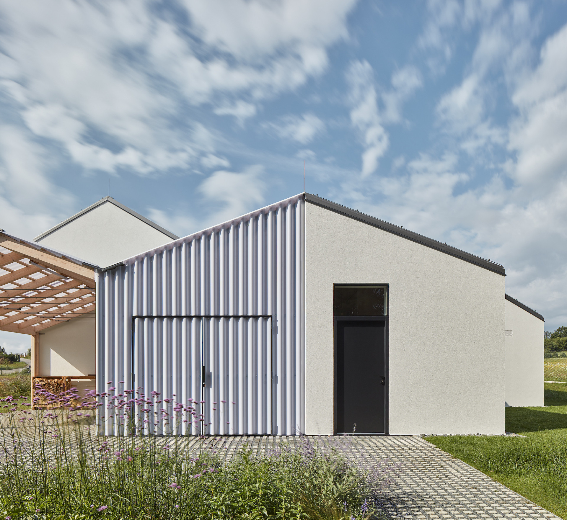 Hmoty obytných částí doplňují vstupní prostory se zázemím, kolna s dílnou a kryté stání.