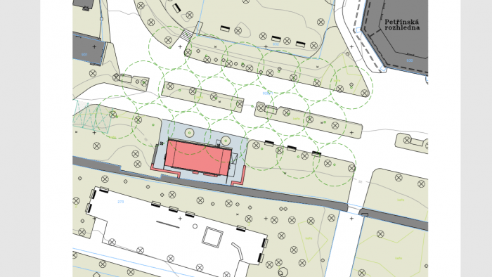 Vzhledem k tomu, že stavba se nachází v historickém prostředí, v těsné blízkosti Hladové zdi, bylo navrženo řešení s minimálními nároky na výstavbu, provoz a údržbu. Proto byl objekt navržen jako dřevostavba, která minimalizuje časové a prostorové nároky na výstavbu. Vnější plášť tvoří titanzinkový falcovaný plech. V místě oken je plášť přerušen průběžnou ocelovou žaluzií, která slouží jako ochranná mříž proti vniknutí a zakrývá rovněž vyústění zařízení vzduchotechniky. Použitý materiál splňuje nároky na odolnost vůči poškození a materiálově odkazuje k sousední Petřínské rozhledně. V průčelí objektu je umístěna předsazená konstrukce treláže pro popínavé rostliny, která zajišťuje větší intimitu u vstupů do toalet a napomáhá objektu splynout s okolím.