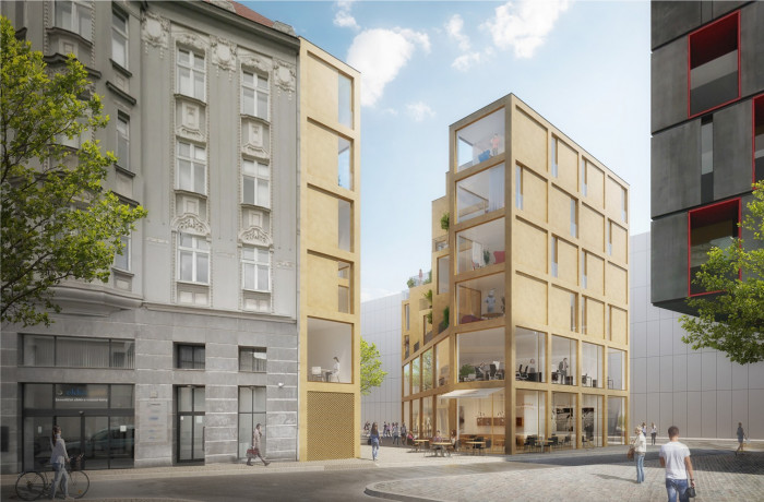 Rozdělením hmoty na menší objekty definuje lidské měřítko zástavby v kontrastu s masivní novou zástavbou v blízkém okolí. Terasovité odskočení fasád přilehlých k průchodu umožňuje osvětlit a proslunit byty a zároveň definuje nový atraktivní až komorní veřejný prostor.