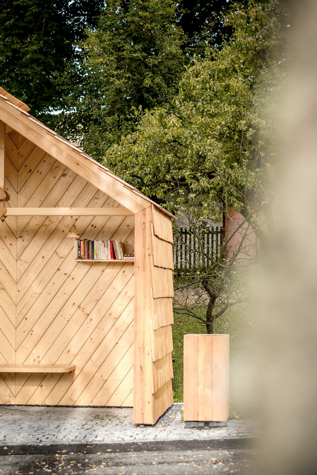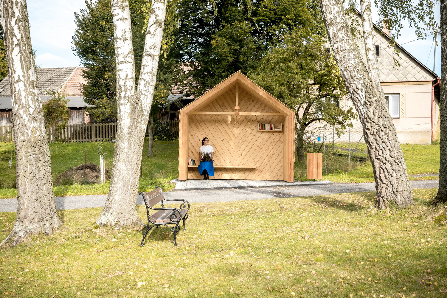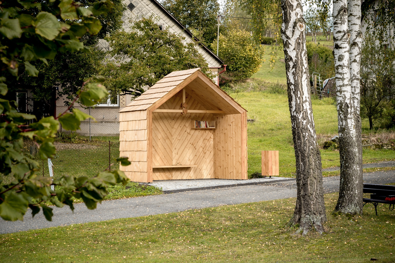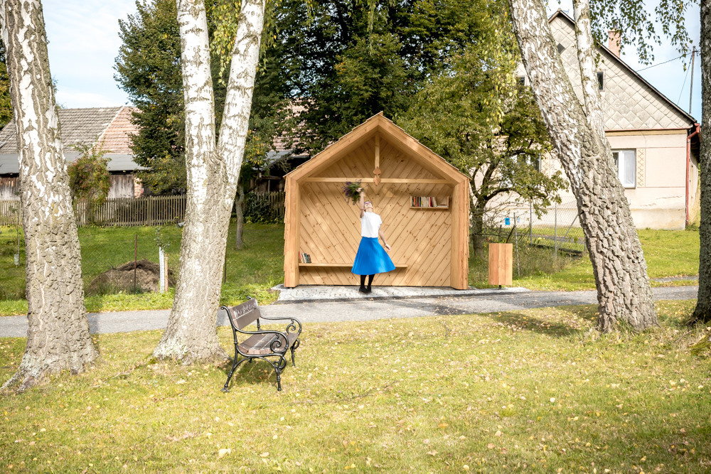 Vzhledem ke stávající skladbě objektů, které přiléhají k návsi (objekty se sedlovými střechami a klasickým obytným tvaroslovím i proporcemi), bereme tento atribut za klíčový. Navrhujeme tedy objekt se sedlovou střechou, ten však má disproporčně malou délku traktu, svým objemem tedy může evokovat hodinový strojek „kukačka“, známý od našich babiček. Abychom tento objekt uchopili citlivě i po materiálové stránce, volíme za hlavní stavební materiál lokální smrkové dřevo: trámy, latě, prkna, šindele. Zpevněné plochy pak realizujeme ve skládané žulové kostce. Vše jaksi účelně, trvanlivě a v souladu s nevelkým rozpočtem. Stavba je vybavena sedací lavicí, poličkou na knihy, košem a lipovým listem pro štěstí. V rámci procesu návrhu jsme kladli důraz na bezpečnost v objektu i kolem něho, trvanlivost a dobrou udržitelnost. Nechť tato zastávka tvoří malou milou dominantu skromné návsi nevelké vesničky v kraji Vysočina.
