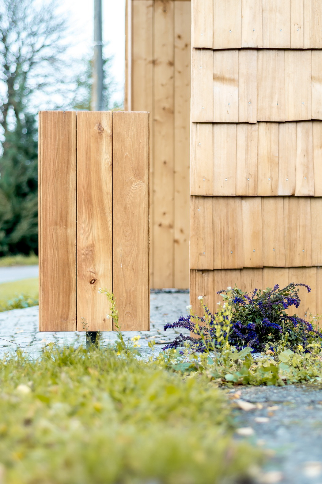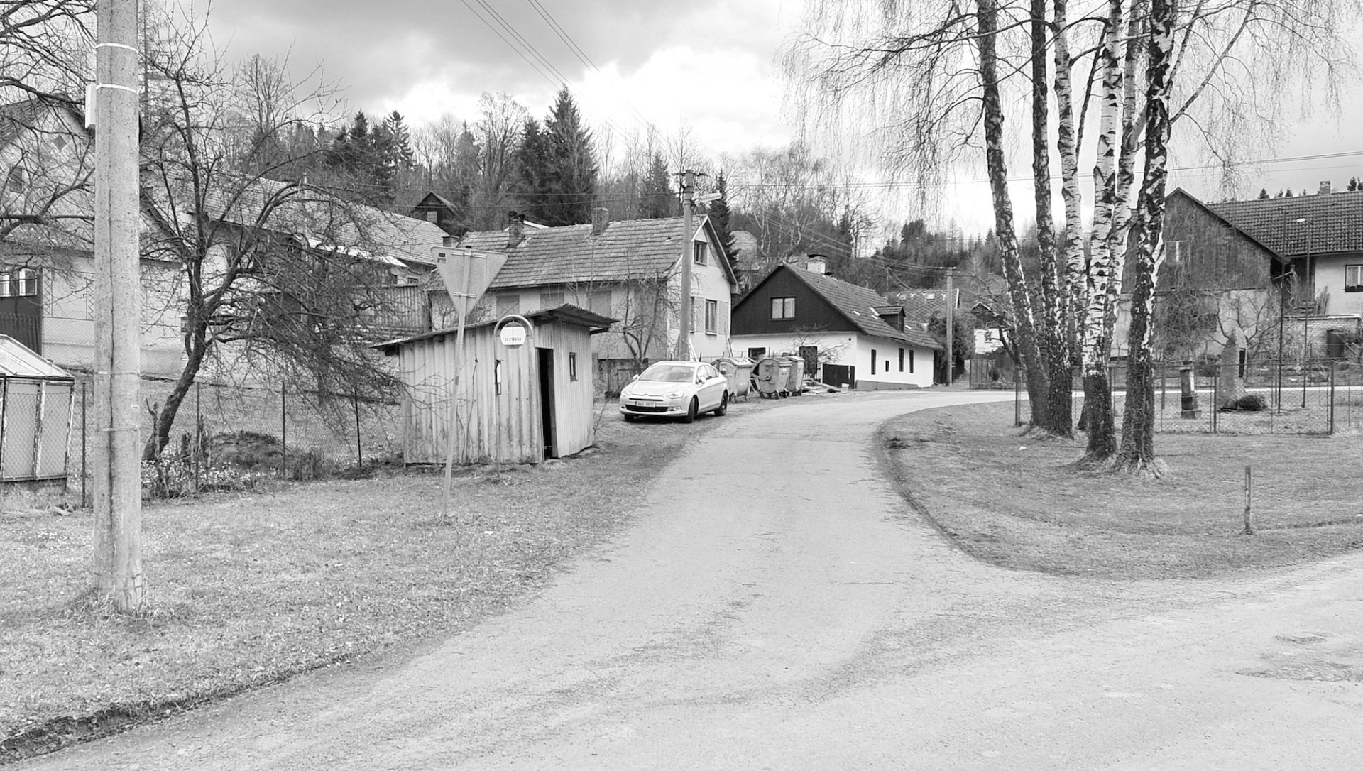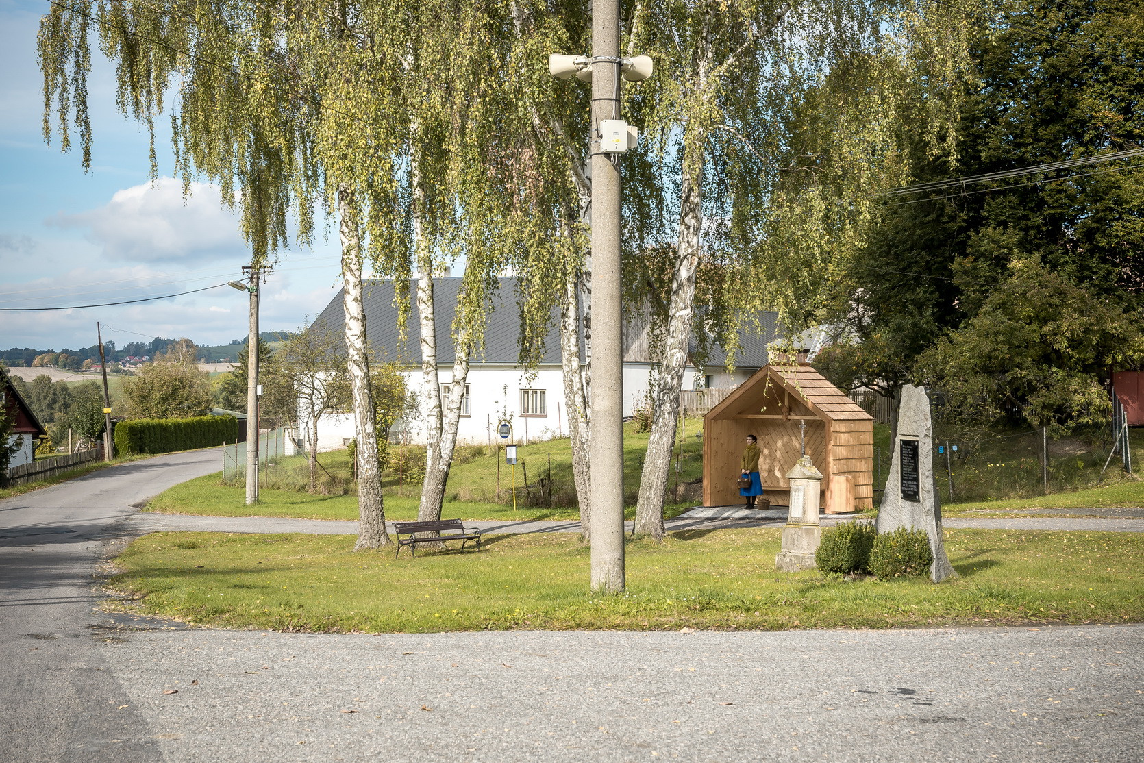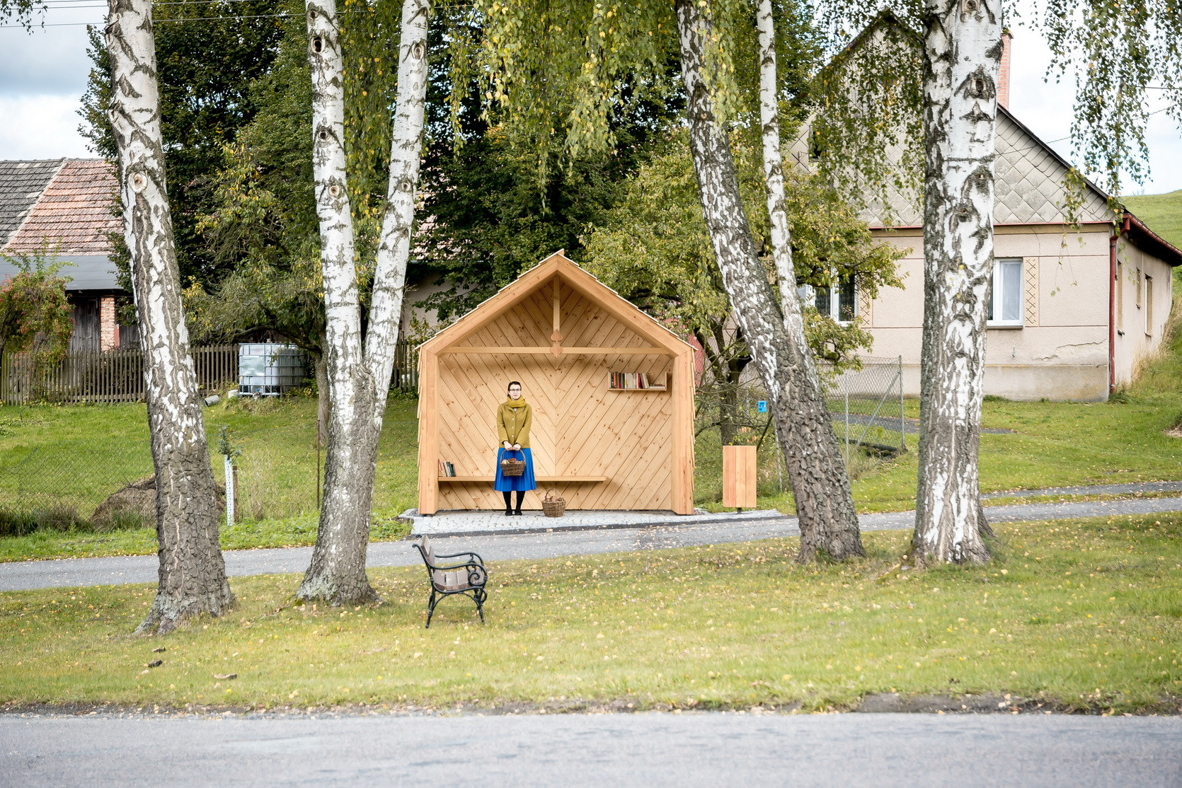 Vzhledem ke stávající skladbě objektů, které přiléhají k návsi (objekty se sedlovými střechami a klasickým obytným tvaroslovím i proporcemi), bereme tento atribut za klíčový. Navrhujeme tedy objekt se sedlovou střechou, ten však má disproporčně malou délku traktu, svým objemem tedy může evokovat hodinový strojek „kukačka“, známý od našich babiček. Abychom tento objekt uchopili citlivě i po materiálové stránce, volíme za hlavní stavební materiál lokální smrkové dřevo: trámy, latě, prkna, šindele. Zpevněné plochy pak realizujeme ve skládané žulové kostce. Vše jaksi účelně, trvanlivě a v souladu s nevelkým rozpočtem. Stavba je vybavena sedací lavicí, poličkou na knihy, košem a lipovým listem pro štěstí. V rámci procesu návrhu jsme kladli důraz na bezpečnost v objektu i kolem něho, trvanlivost a dobrou udržitelnost. Nechť tato zastávka tvoří malou milou dominantu skromné návsi nevelké vesničky v kraji Vysočina.