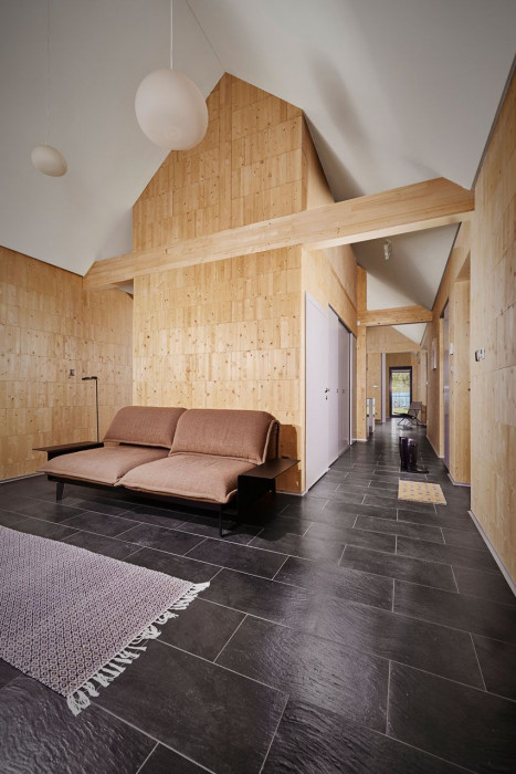 Dom je postavený v Lučatíne, malej obci pri Banskej Bystrici, kde má mama rodinné väzby. Toto krehké prostredie jasne vystavilo medze riešenia a východiská– hmota domu, mierka, urbanizmus obce, drevo ako materiál – konštrukčný aj výrazový. Na mieste novostavby stál starší, stavebne už nepoužiteľný tehlový dom. Nový objem sa chová v priestore veľmi podobne.