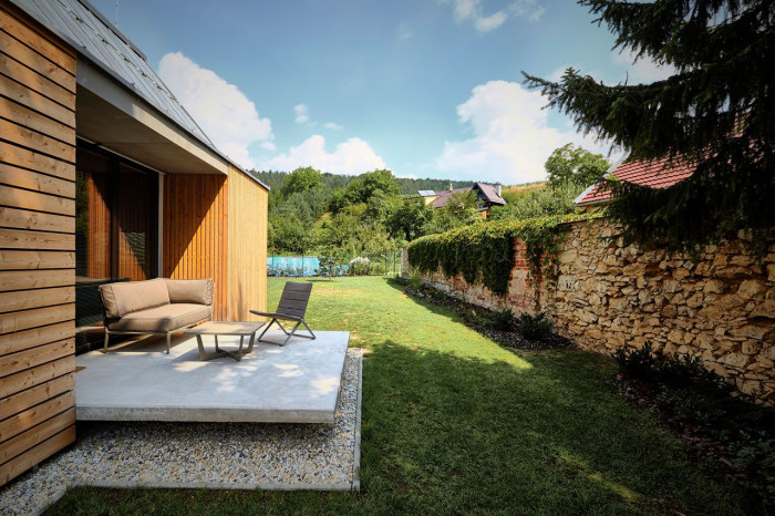 Odstránenie drevenej stodoly v zadnej časti pozemku nebolo jednoduché rozhodnutie ale novému bývaniu otvorilo úplne nový priehľad do prírodnej krajiny okolia bez toho aby sa narušil uličný rytmus. Jestvujúci susedný kamenný múr ako aj voľne rastúce stromy boli pevným programom, s ktorým dom komunikuje.